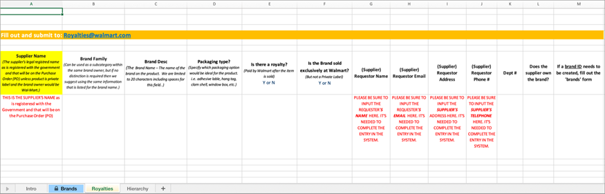 - Si es necesario agregar la marca al Sistema de gestión de cotizaciones (QMS), también deberá completar la pestaña Regalías.Asegúrese de que el nombre registrado legal del proveedor, tal como está registrado ante el gobierno y estará en la Orden de compra, esté en la Columna A de las pestañas Marca y Regalías.Si la marca será para cualquier otro país que no sea EE. UU., indíquelo y envíe el formulario por correo electrónico a nuestro .Equipo de regalías de marca