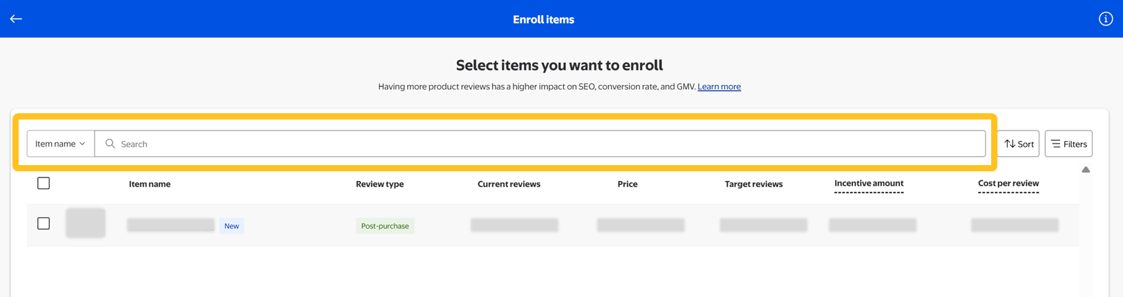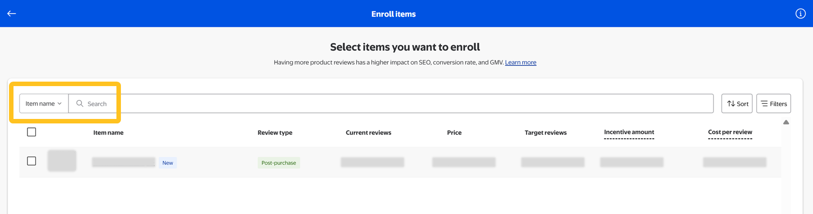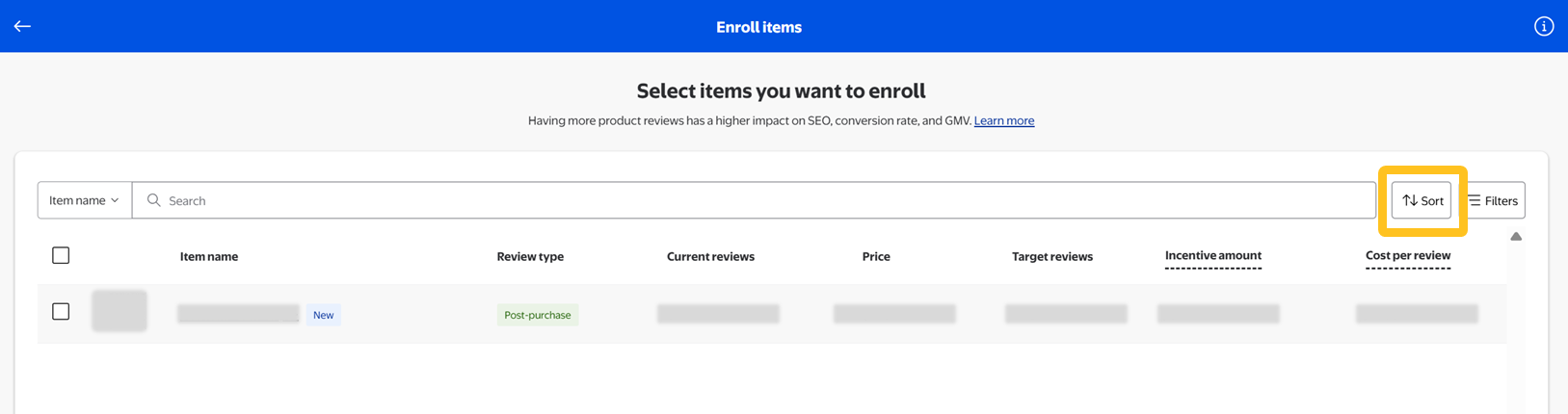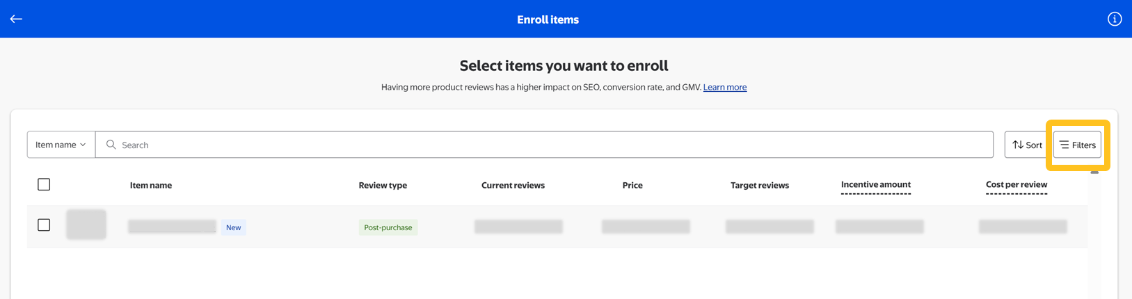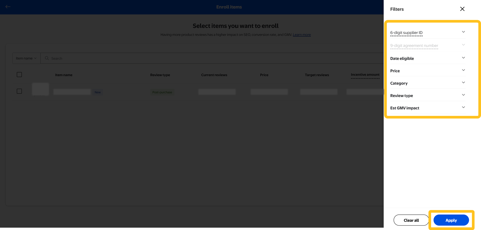 - Click Filters to apply filters for 6-digit supplier ID, 9-digit agreement number, Date eligible (Start date/End date), Price, Category, Review type (Post-purchase), and/or a range of Est GMV impact. Then, click Apply.