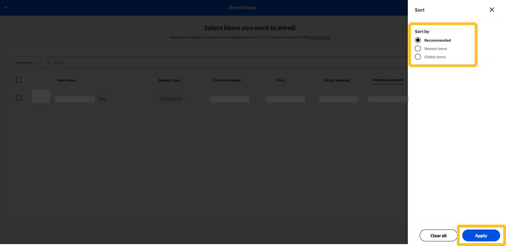 - Click Sort to sort the list of items by Recommended, Newest items, or Oldest items, then click Apply.