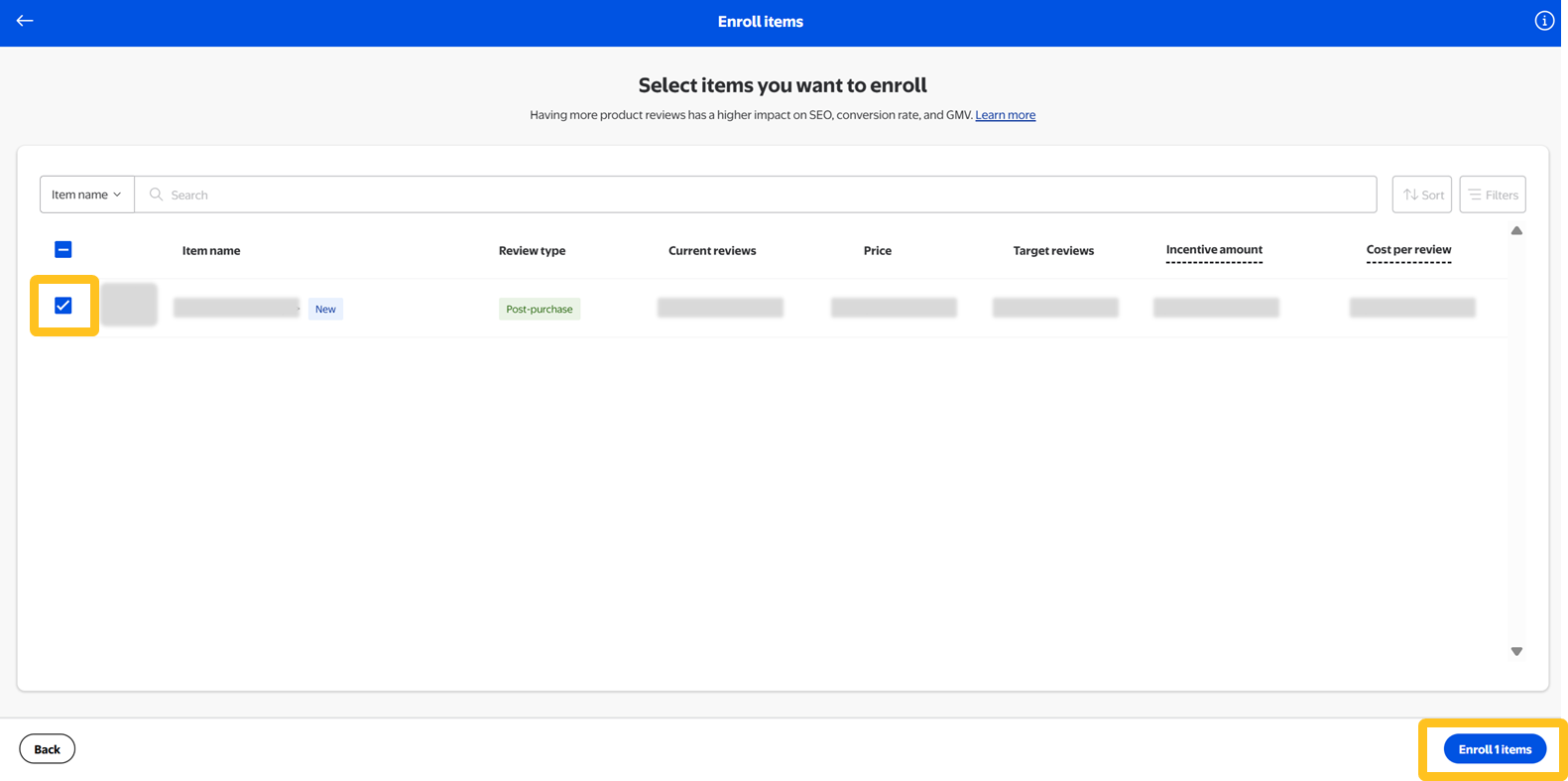 - Once you've found the items you want to enroll, click the check boxes next to the item (up to 200 items) names to select them. Then, click the Enroll # items button.