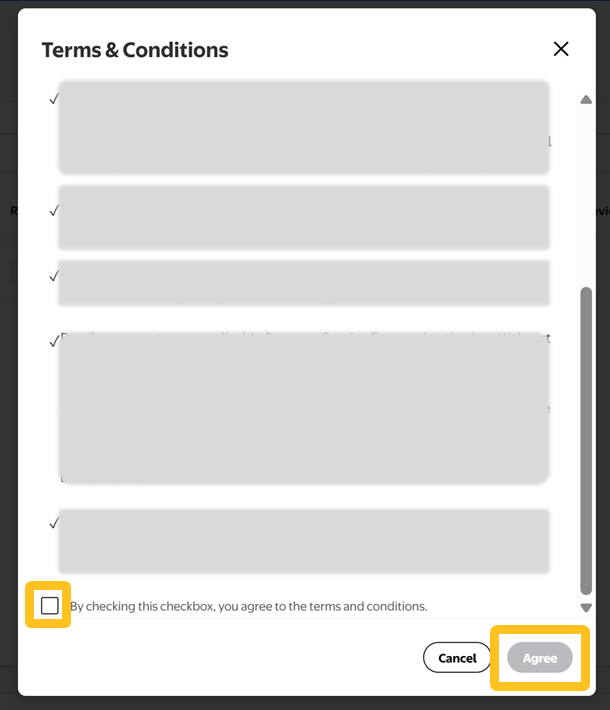 - Click the check box to acknowledge that you agree to the terms and conditions. Then, click the Agree button.