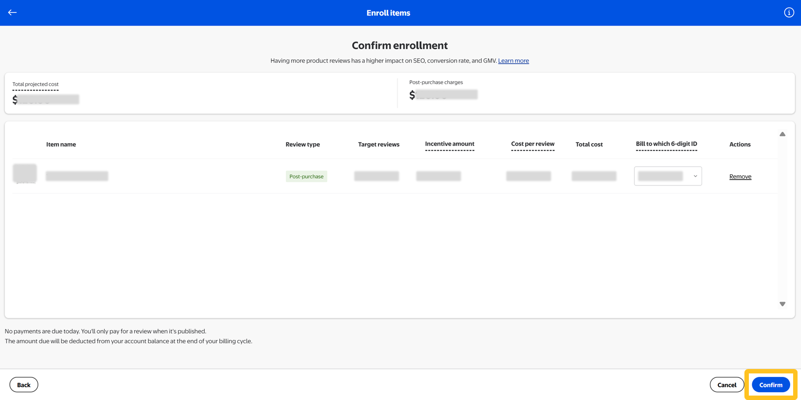 When you enroll items, you’ll be charged a fee per review corresponding to the amount in the Cost per review column shown on the Review Accelerator dashboard in Supplier One (for eligible and participating items). You’ll also be charged for collected reviews up to the amount specified in the Target reviews column (based on the target number you’ve set). Regardless of the rating, all customer reviews will be posted on the item page and can be identified with an Incentivized Review badge.