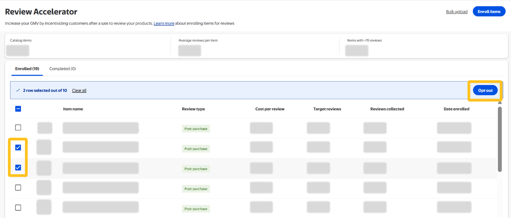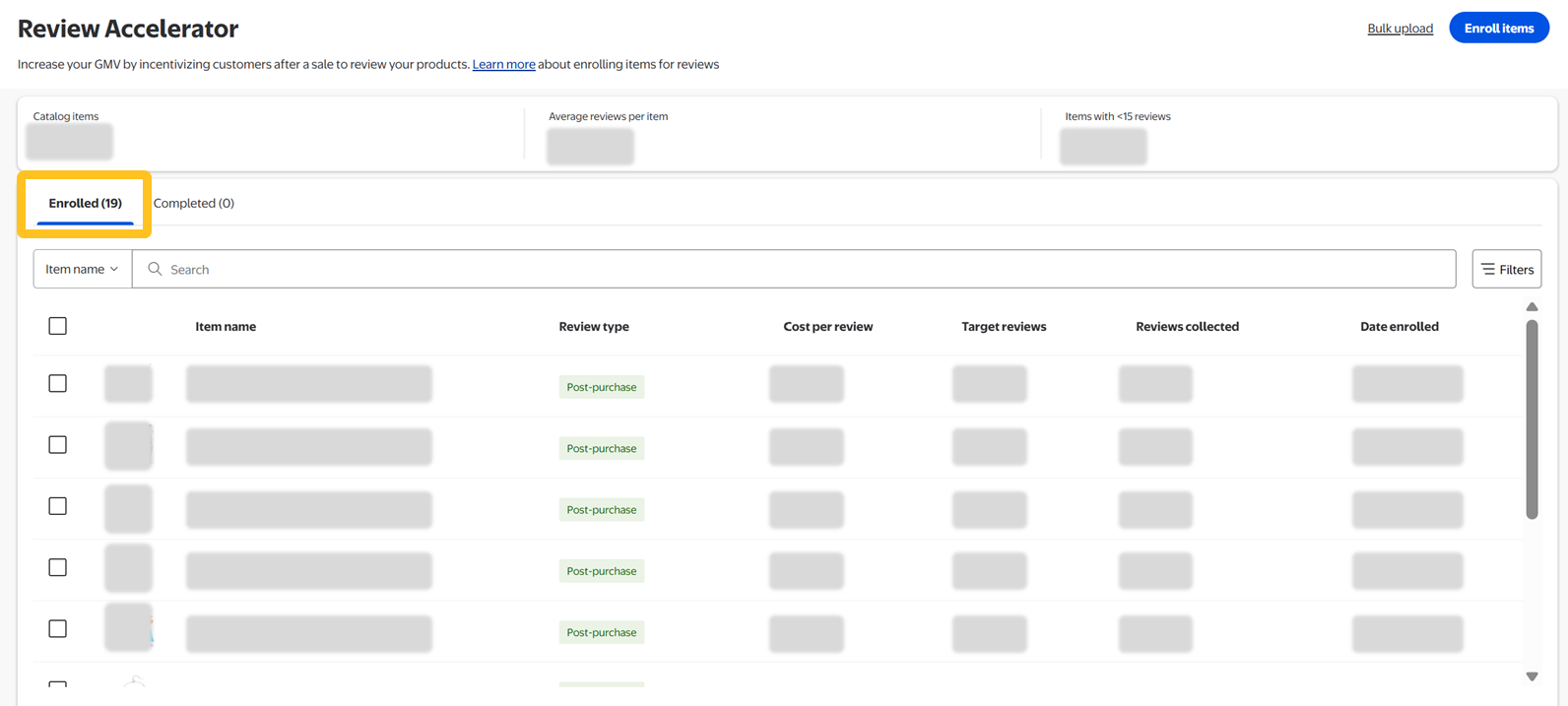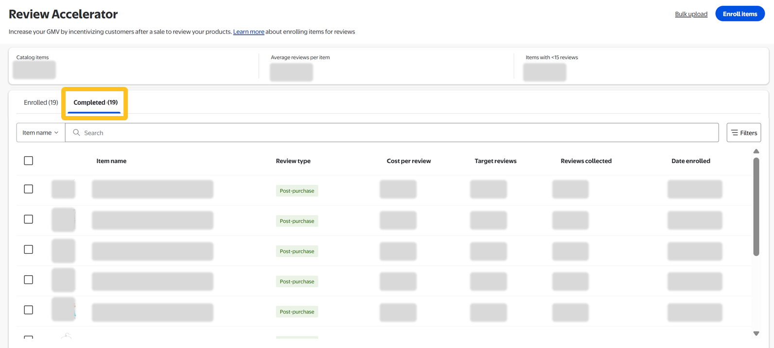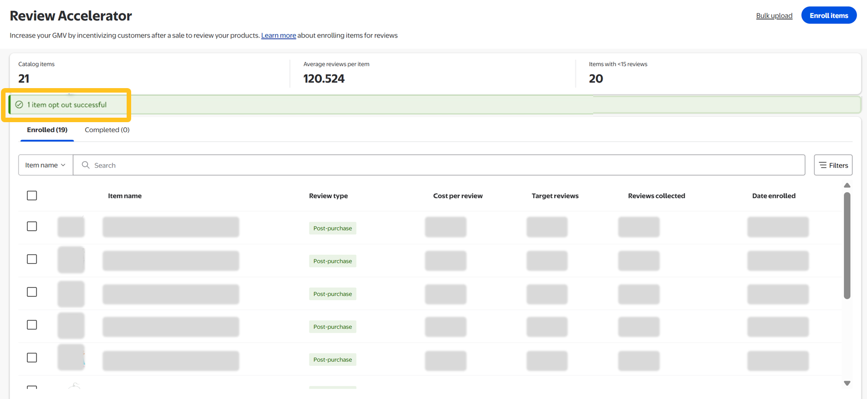 - All the items listed have received the target number of incentivized reviews. For these completed campaigns, items will automatically be removed from Review Accelerator and the items cannot be re-enrolled.