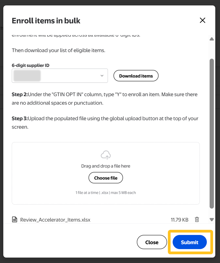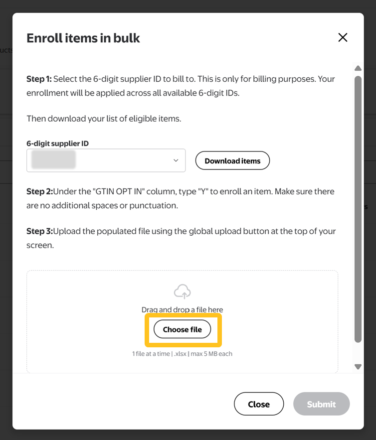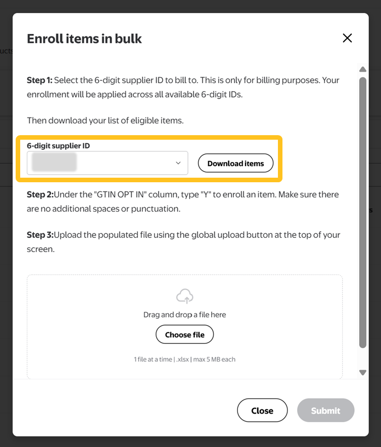 - Open the drop-down menu and select the 6-digit supplier ID that you want to bill enrolled items to. Then, click the Download items button.