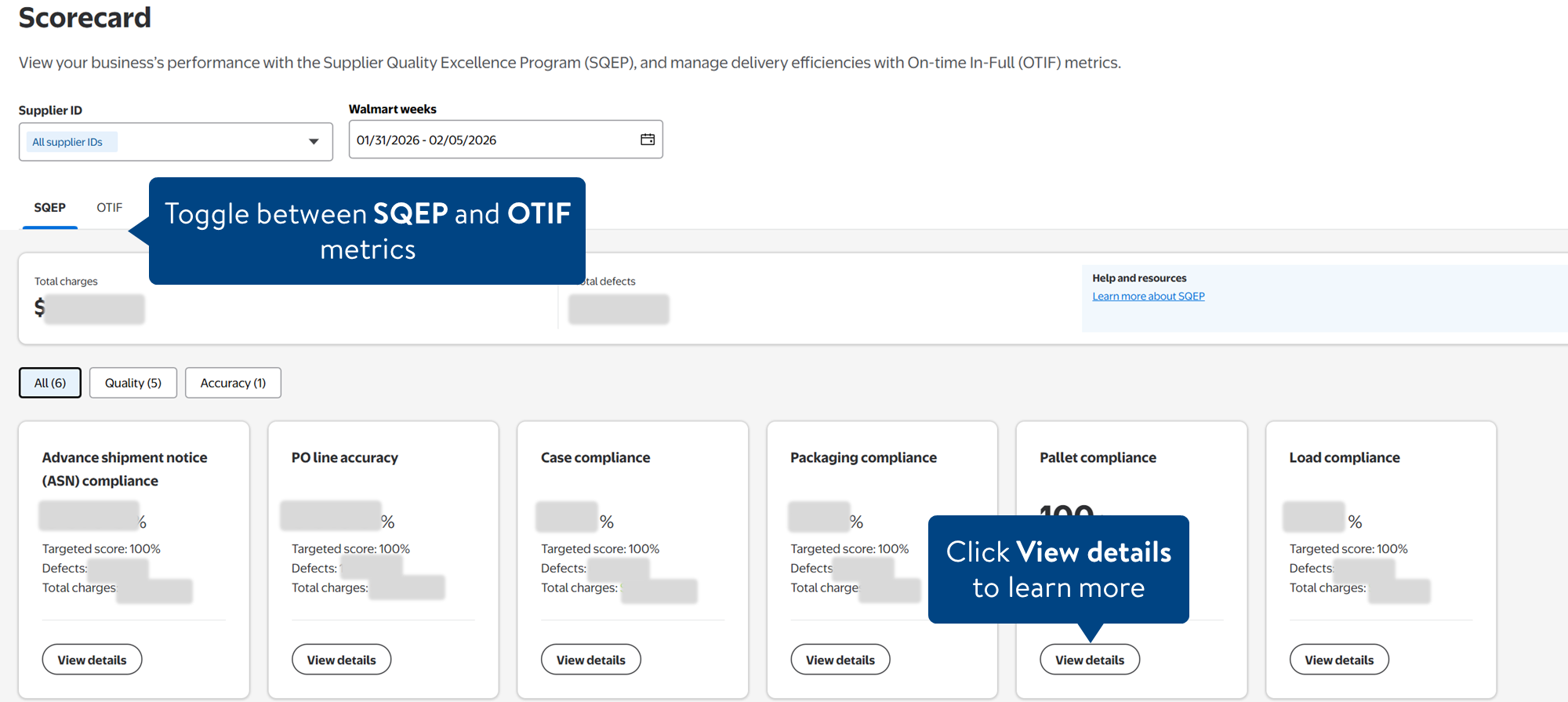 - You will see tabs for SQEP and OTIF which include key metrics for your business. The metrics include the current score and target score. Click View details to learn more.