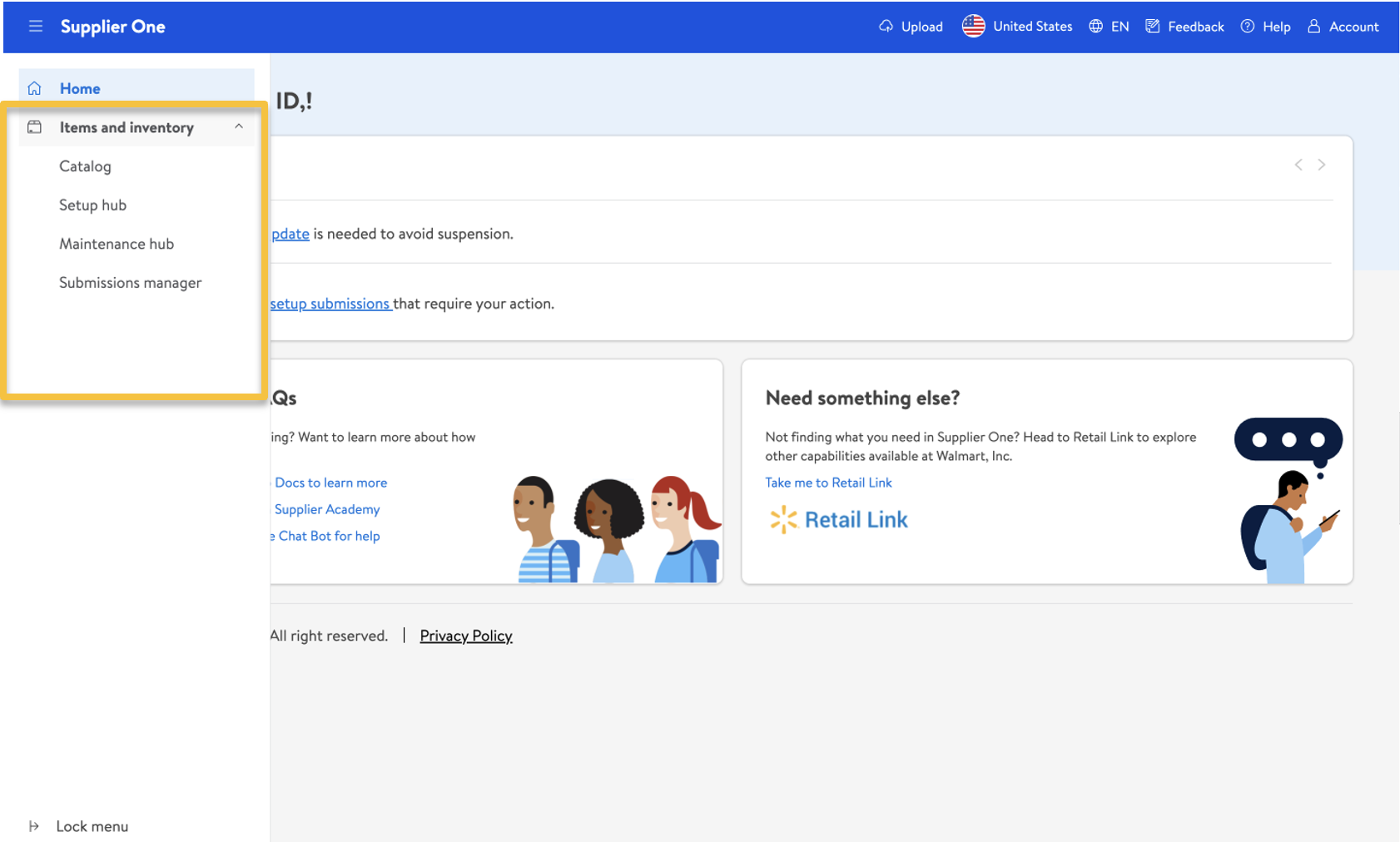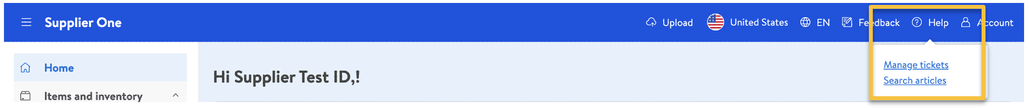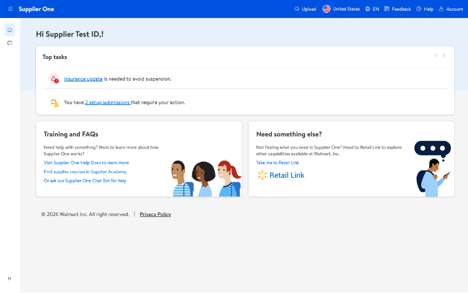 If you have questions about using Supplier One or run into unexpected issues, click Help at the top right corner of your window for options.