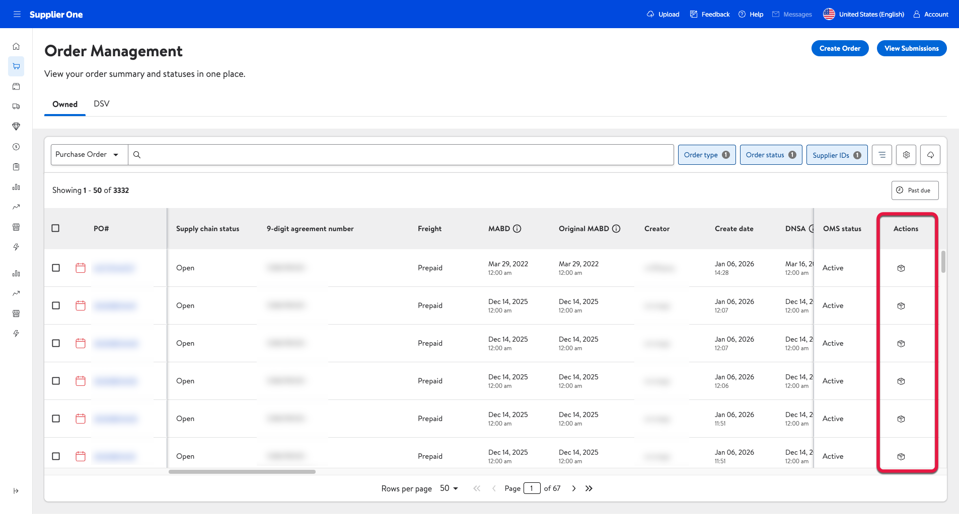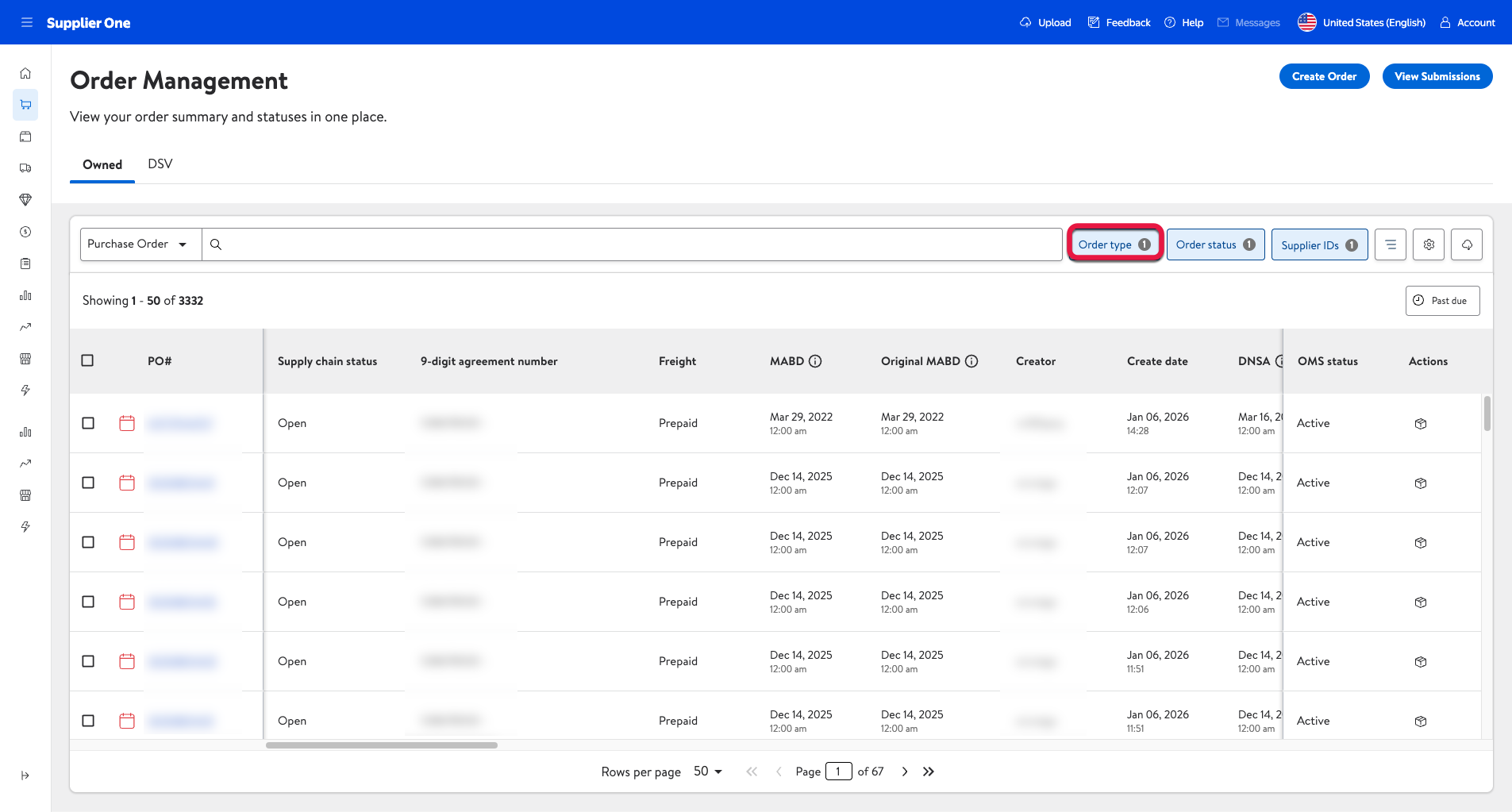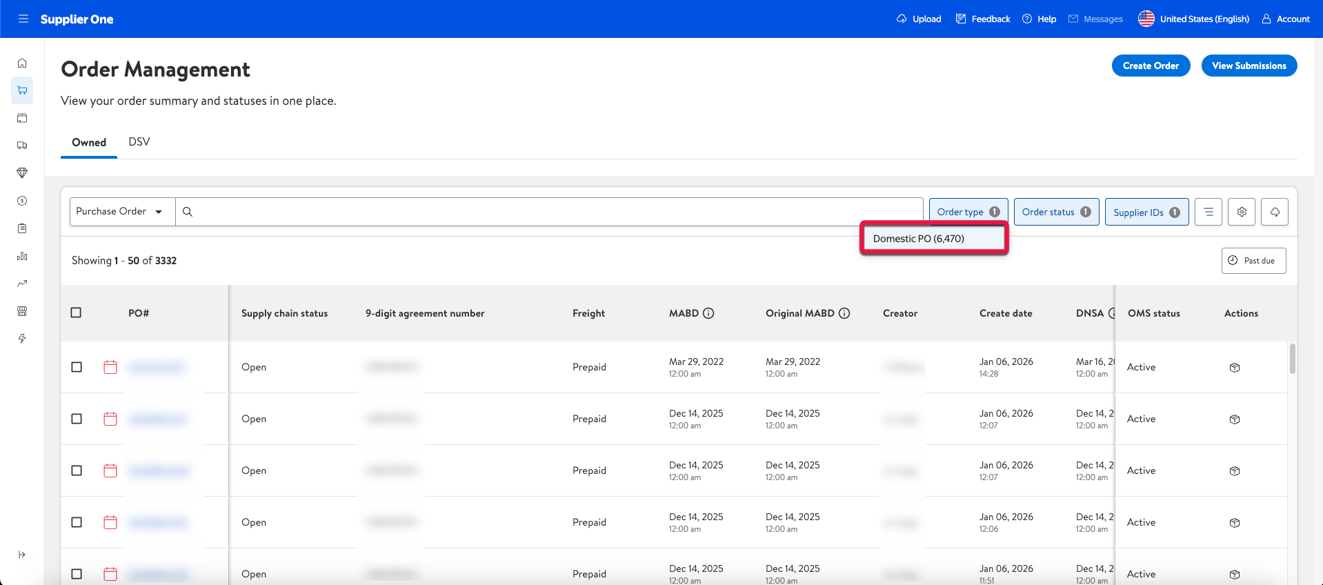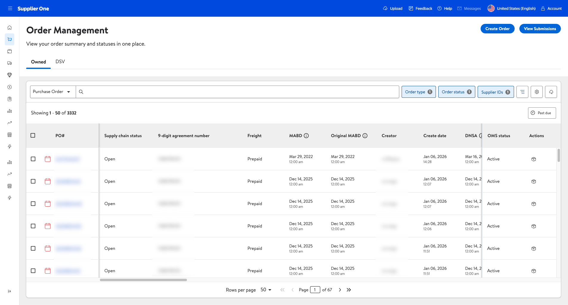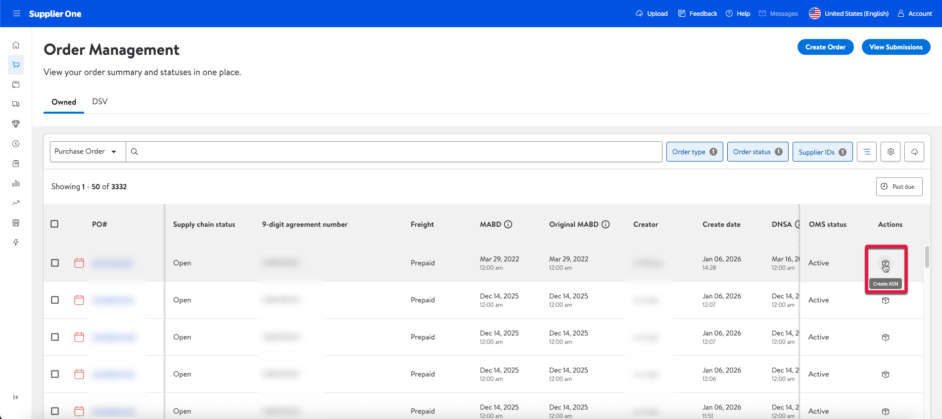 On this page, you can view your POs, create Advanced Shipment Notices (ASNs), and manage the statuses of both Owned and DSV order types.