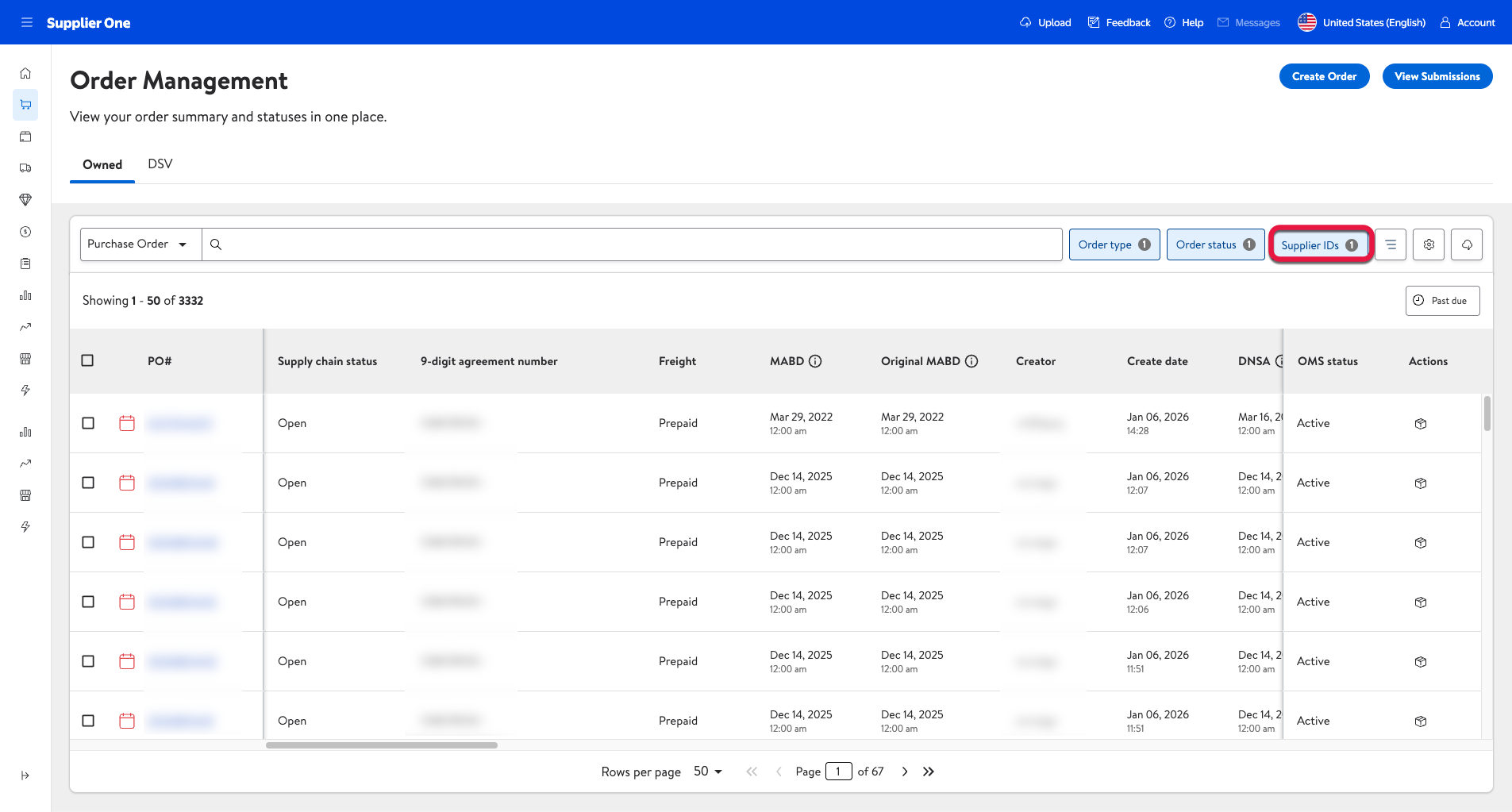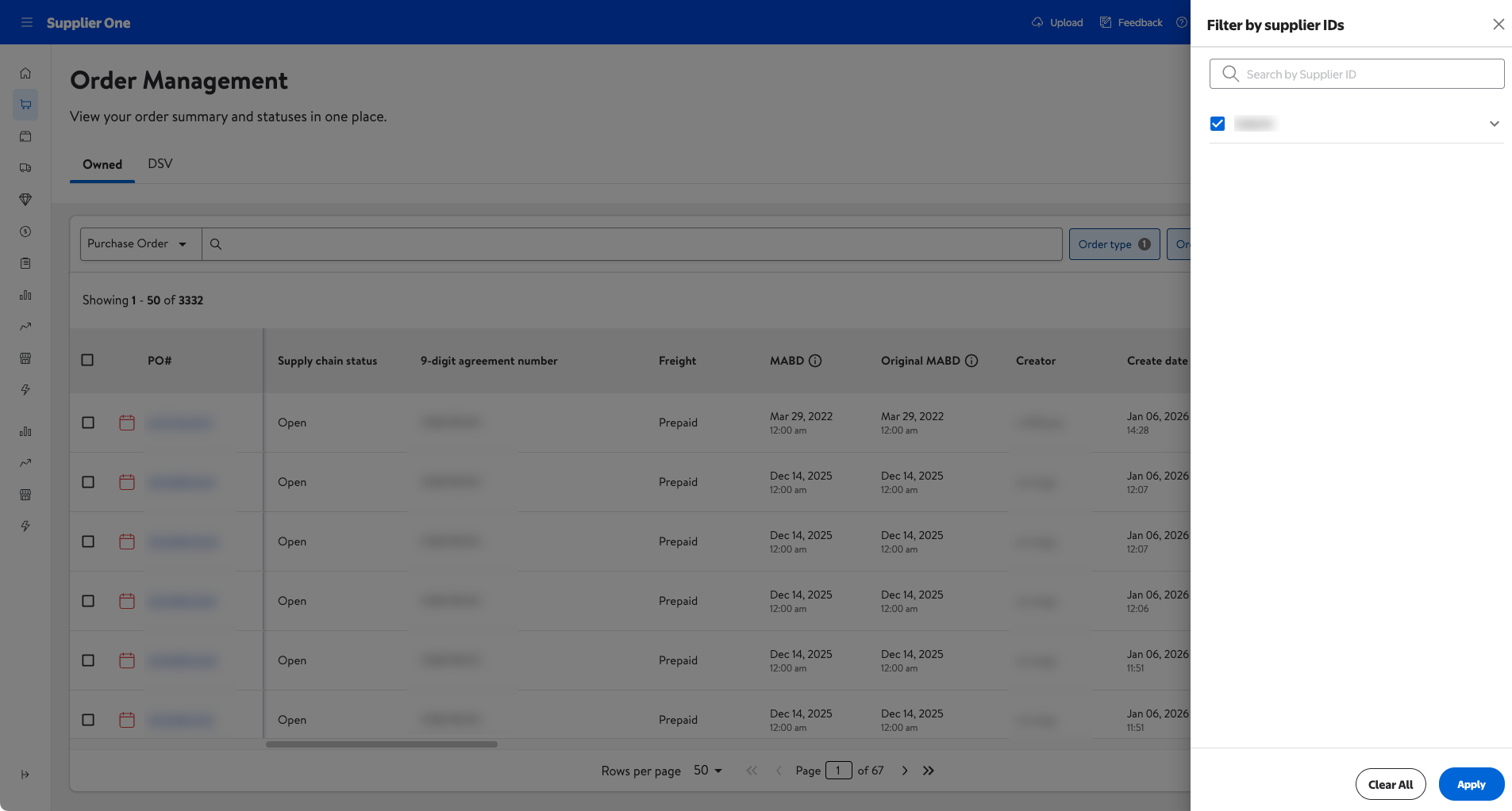 If you’re managing multiple Supplier IDs, you can select the Supplier IDs filter function to show POs for one or multiple Supplier IDs at one time.