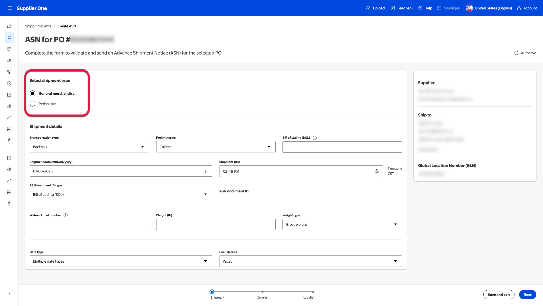 Select an ASN type, either General merchandise or Perishable, based on your shipping product type.