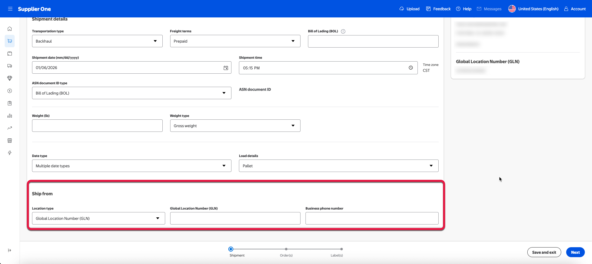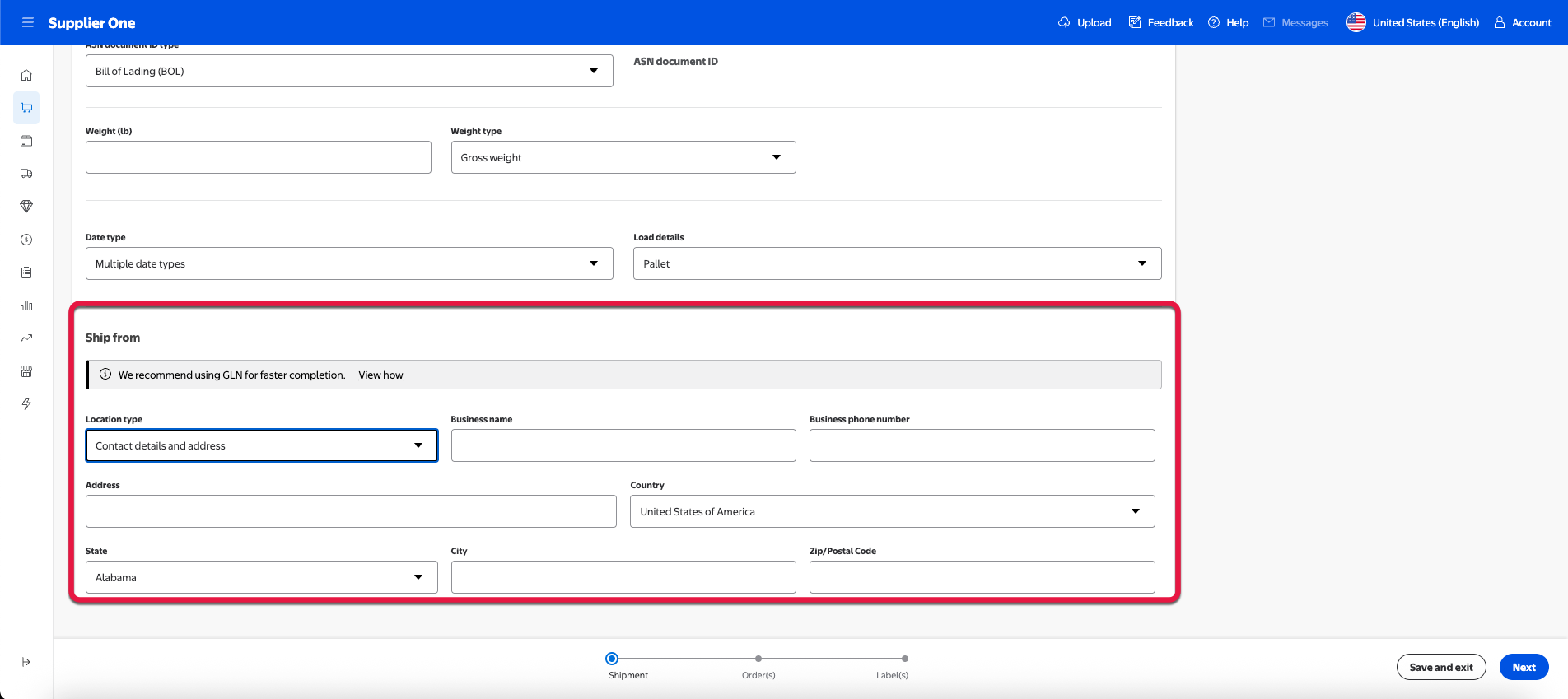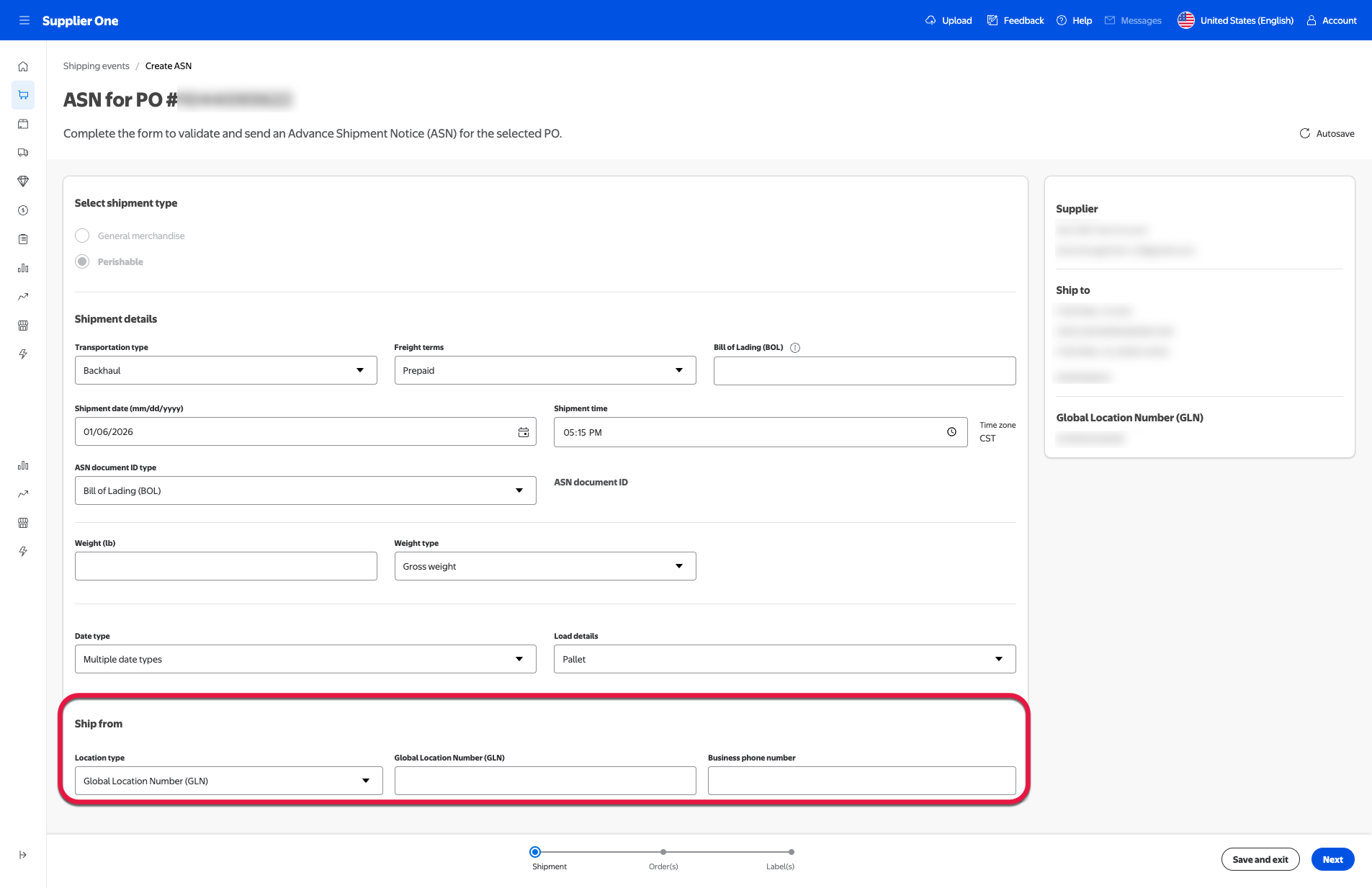 If the POs you’re creating an ASN for are FSMA-eligible, a Ship from section will appear under Shipment details.