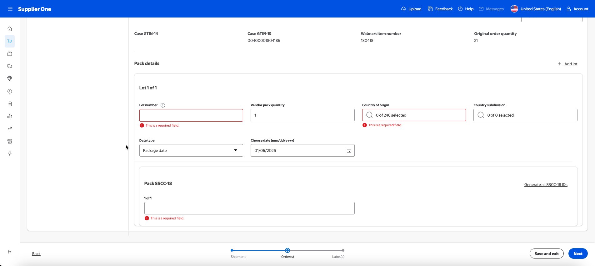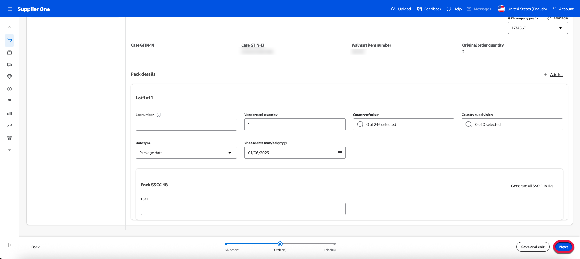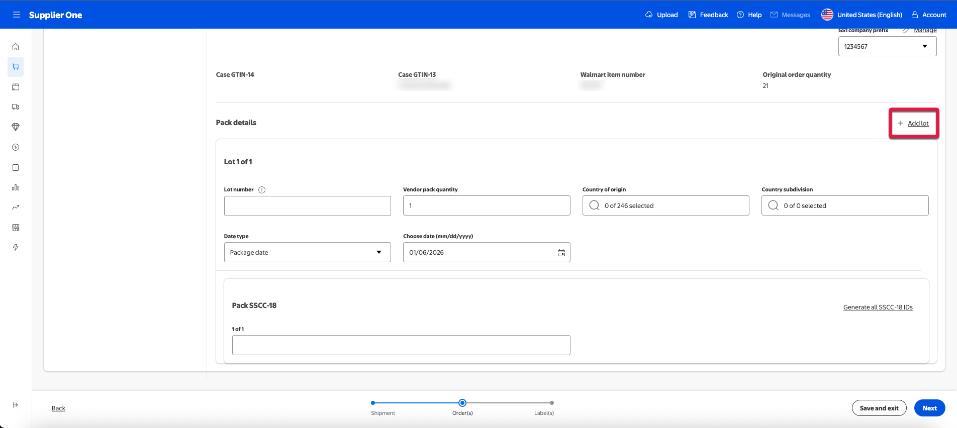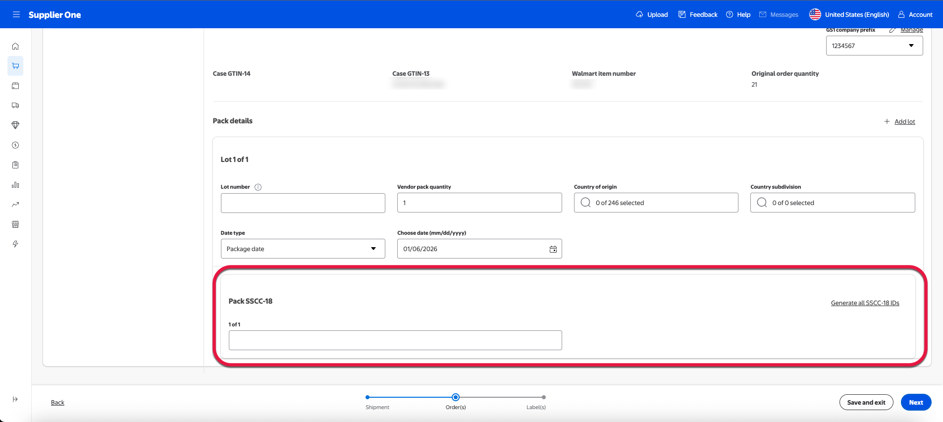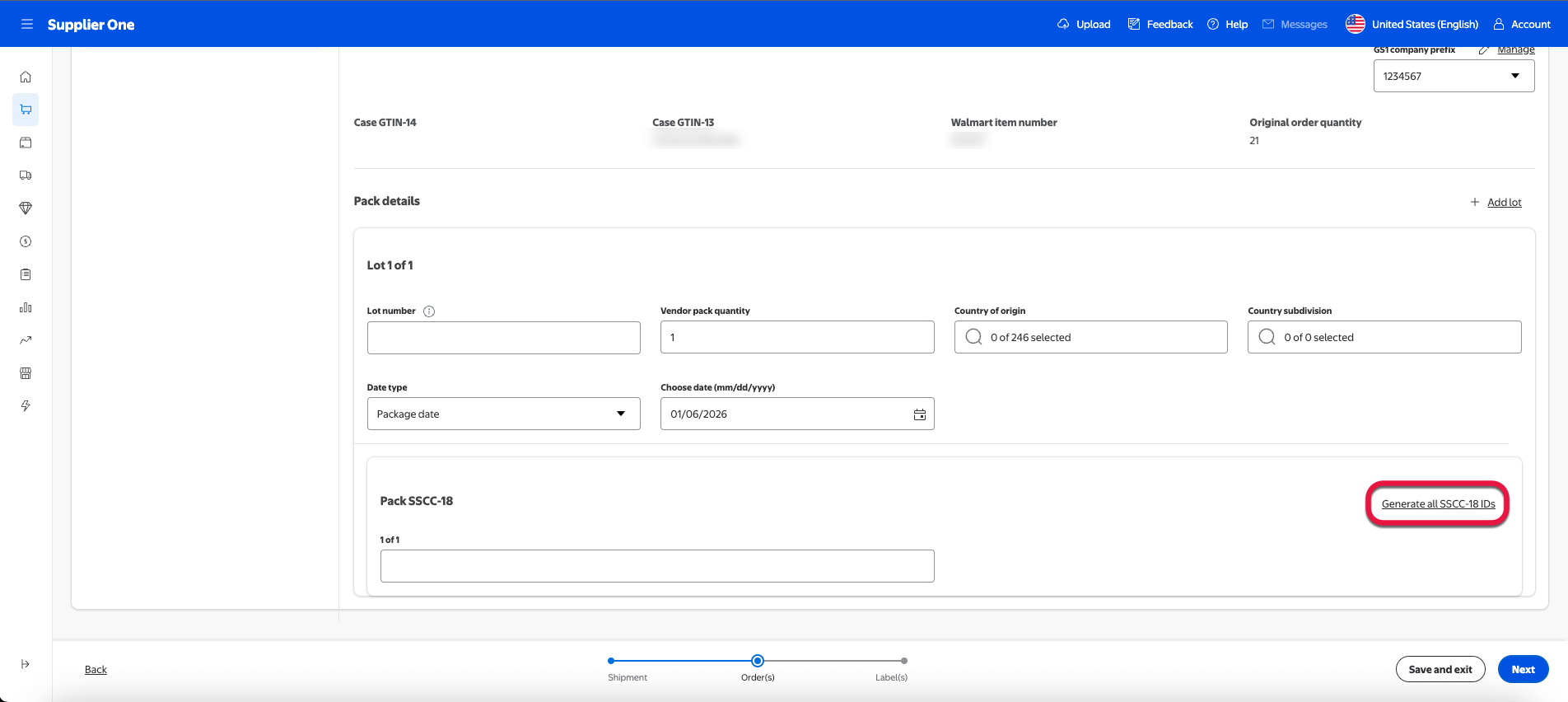 For suppliers onboarded to the managed SSCC-18, you can select Generate all SSCC-18 IDs to auto populate an SSCC-18 code. For more information regarding managed SSCC-18 or if you’d like to learn how to enroll, refer to the SSCC-18 section of this guide.