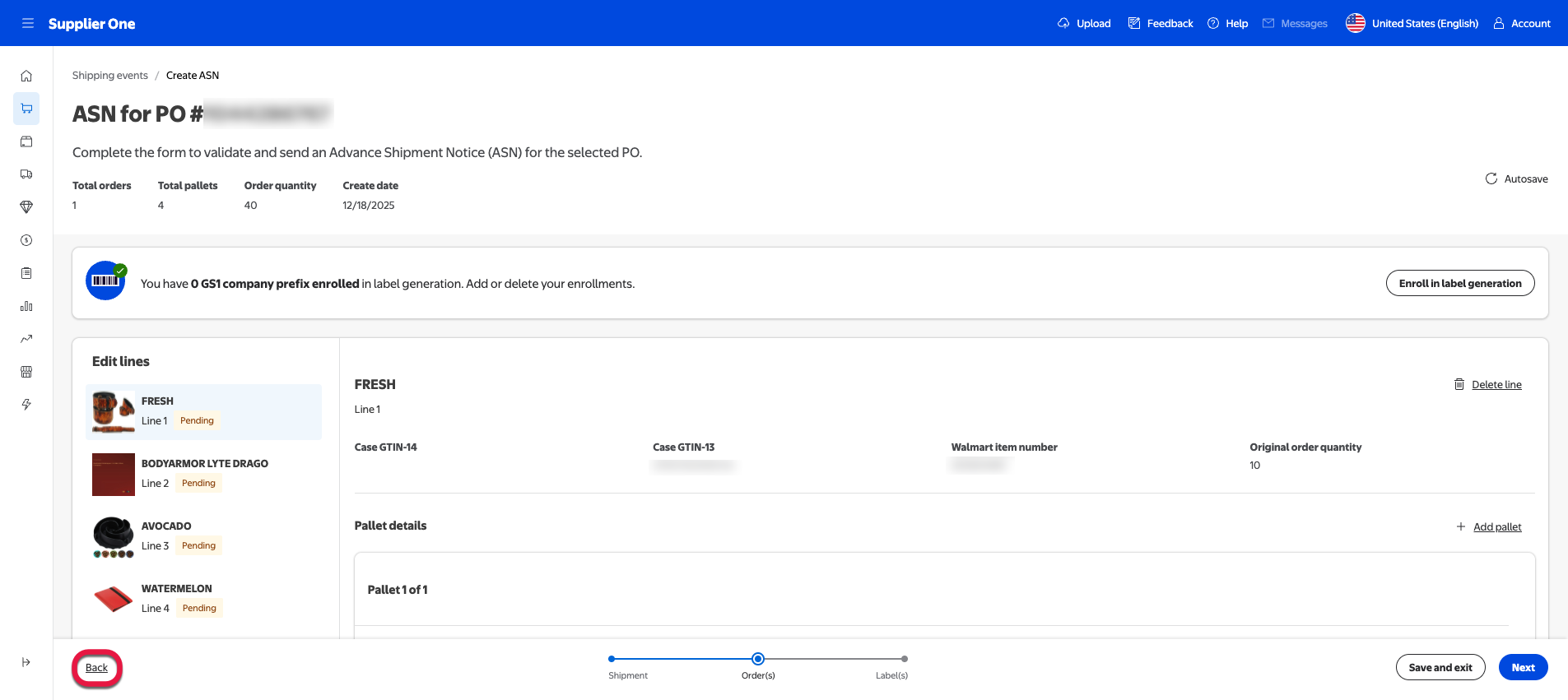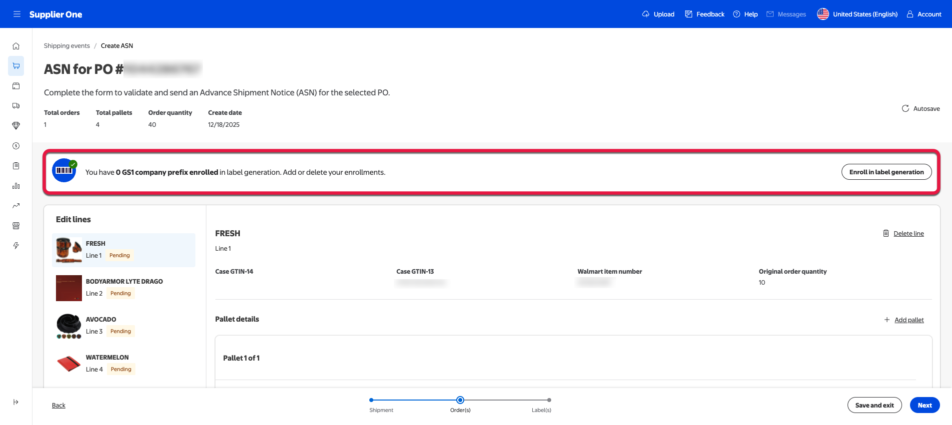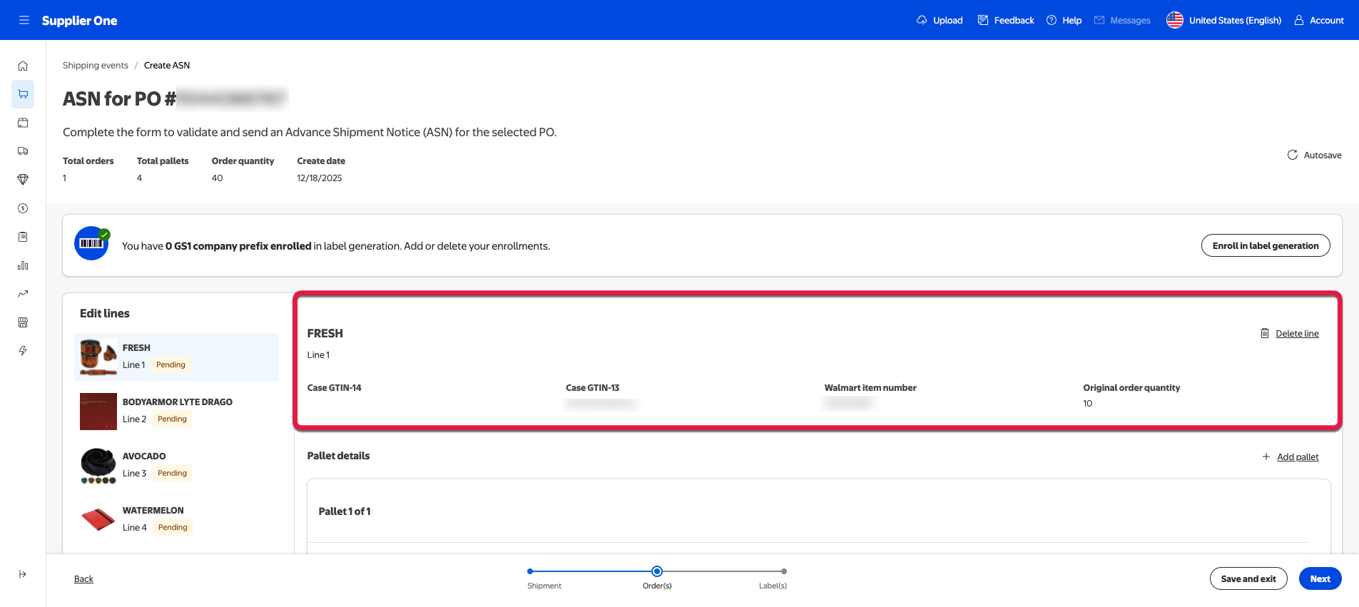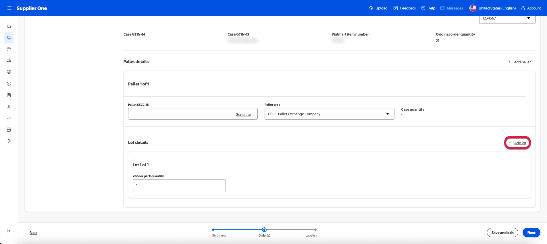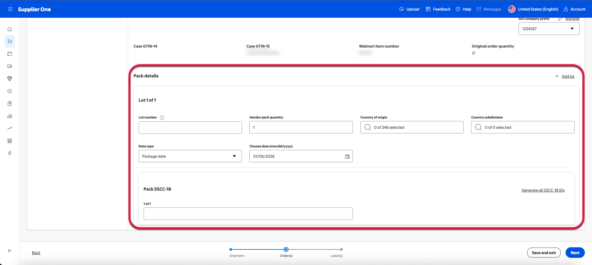 For suppliers onboarded to the managed SSCC-18, you can select Generate all SSCC-18 IDs to auto populate an SSCC-18 code. For more information regarding managed SSCC-18 or if you’d like to learn how to enroll, refer to the SSCC-18 section of this guide.