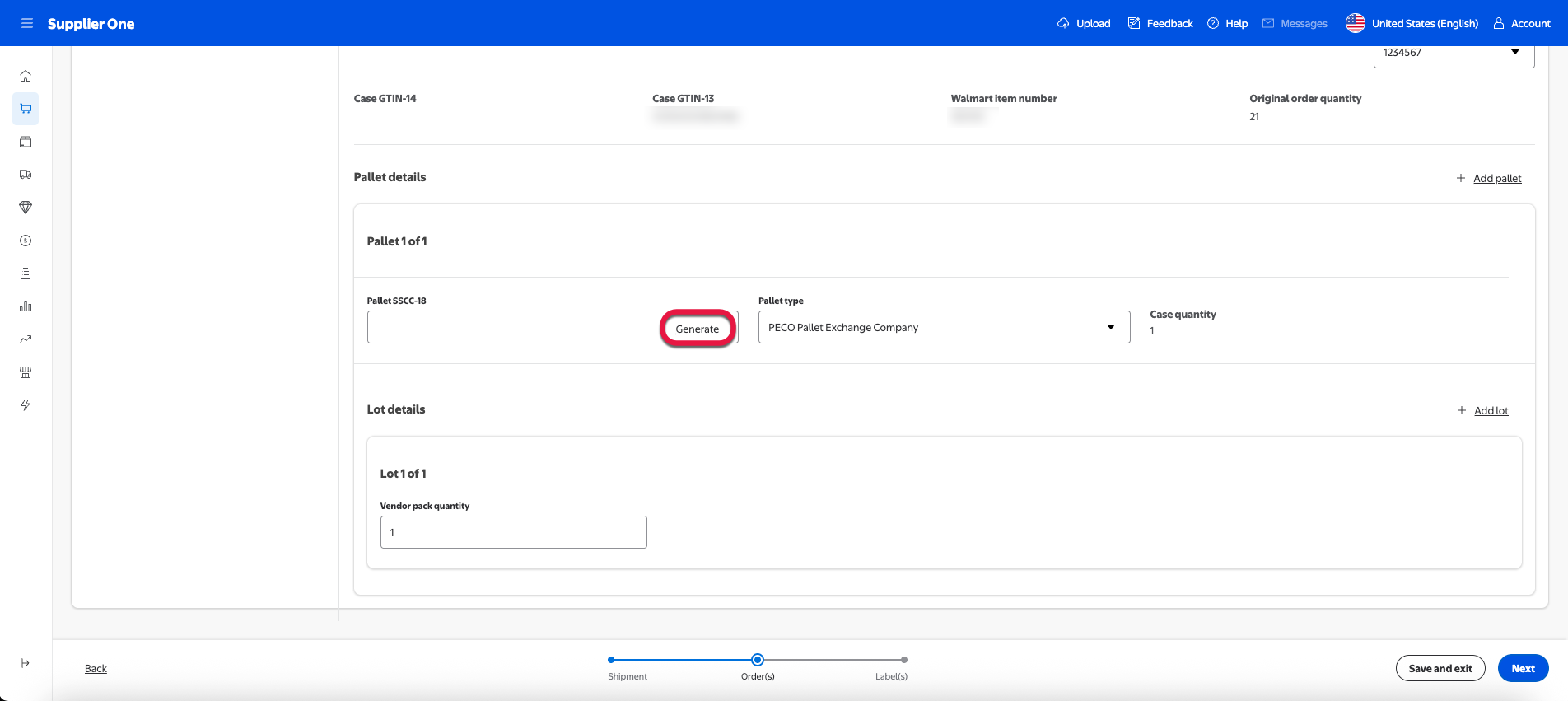 For suppliers onboarded to the managed SSCC-18, you can select Generate in the Pallet SSCC-18 field to auto-populate an SSCC-18 code. For more information regarding managed SSCC-18 or if you’d like to learn how to enroll, refer to the SSCC-18 section of this guide.