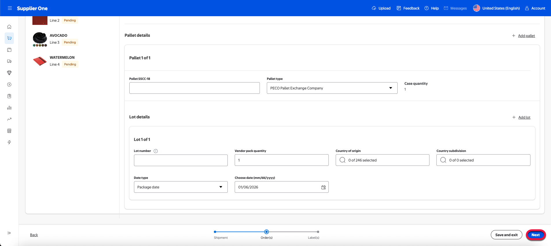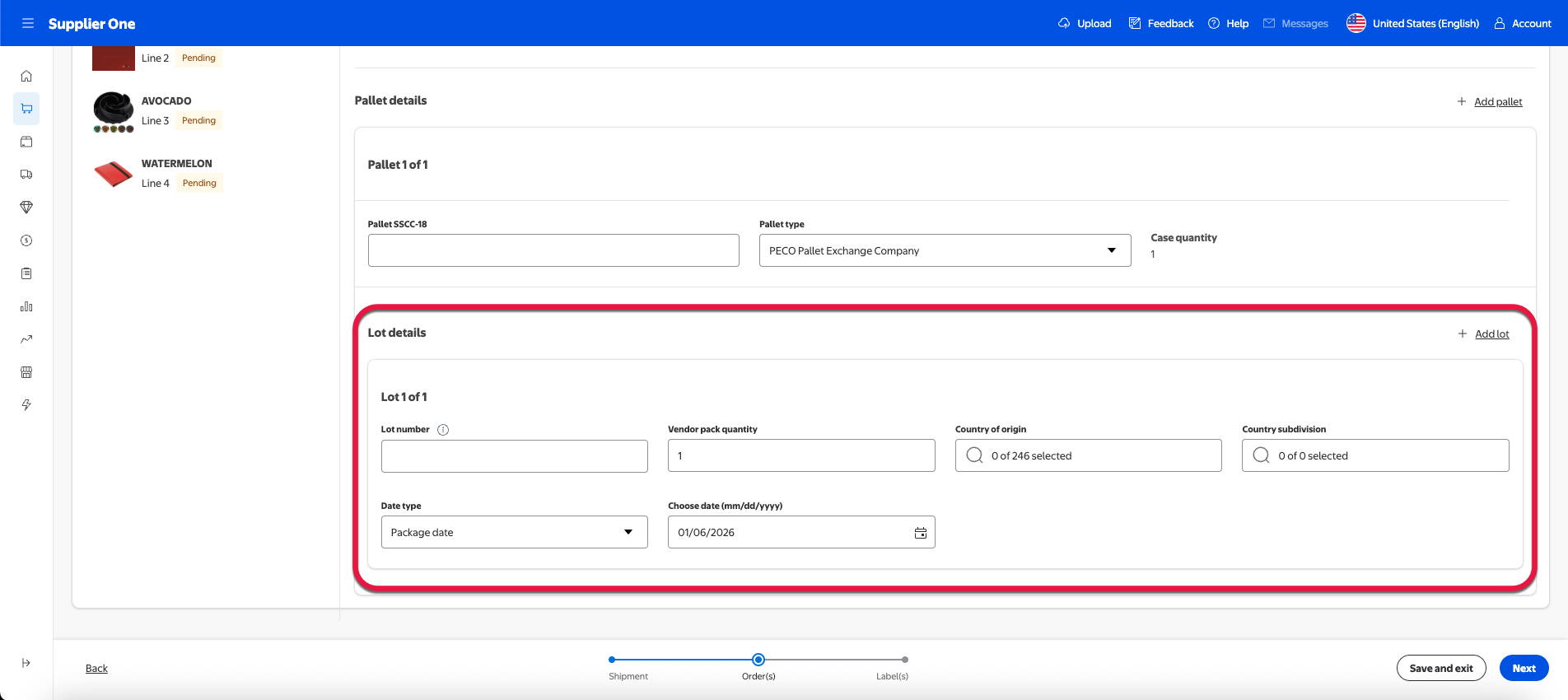 Located within Pallet details section, the Lot details section requires you to enter lot-specific information concerning your shipment.