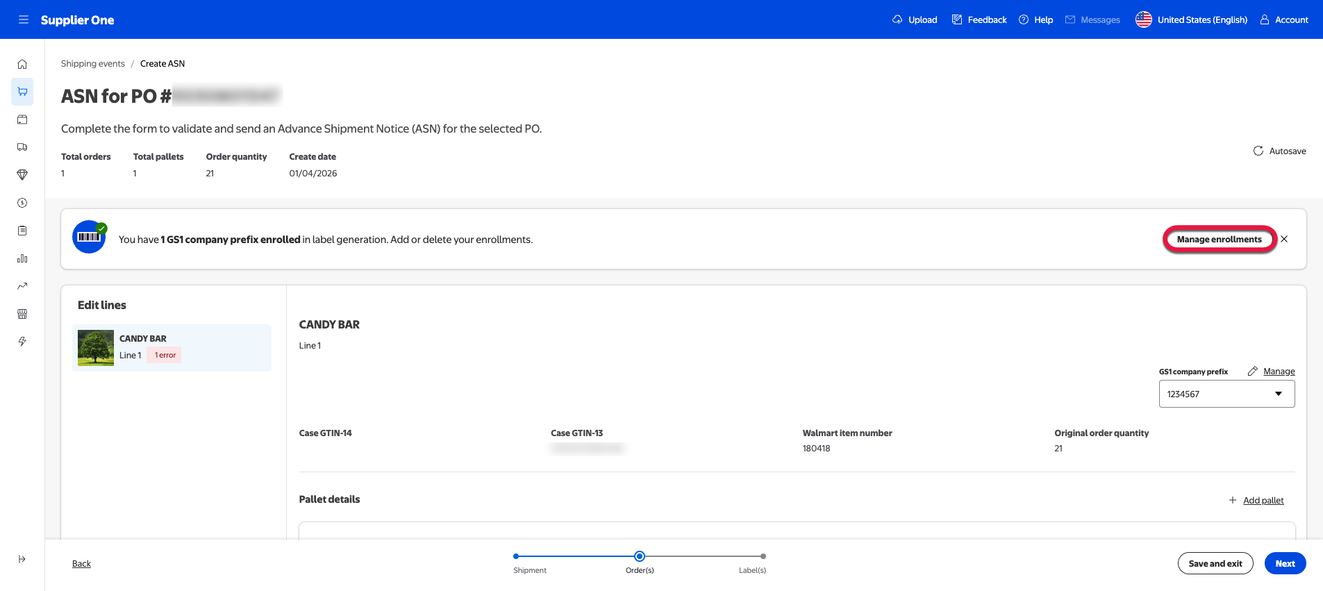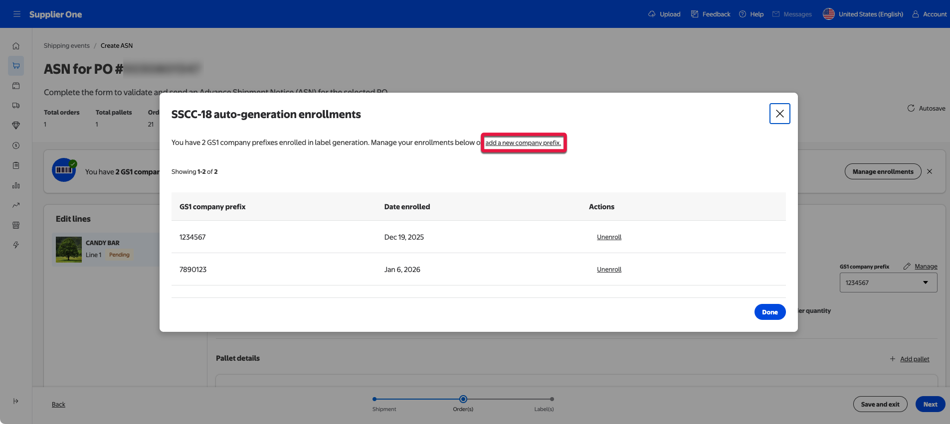 The page will refresh and return you to the ASN for PO page. If the enrollment process was successful, the banner will show how many company prefixes are enrolled.