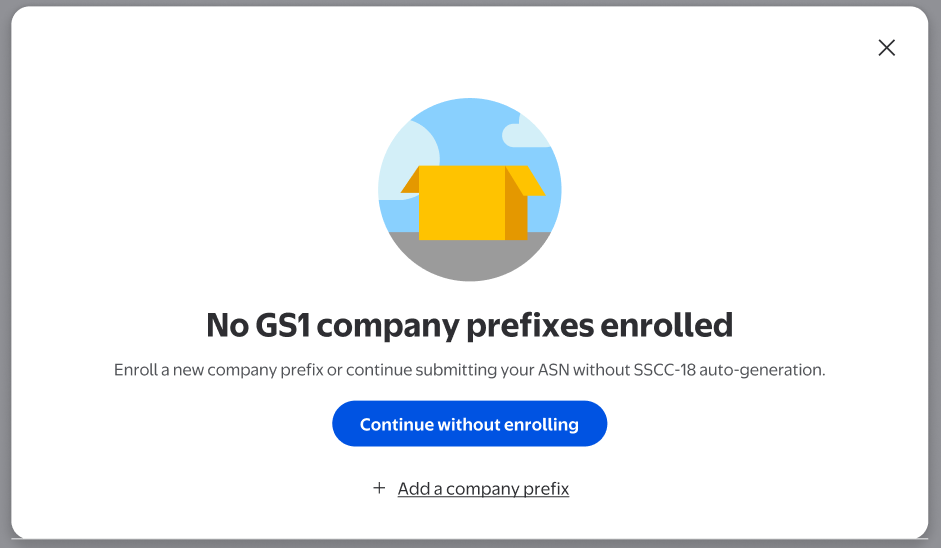 Select Add a company prefix to enroll in SSCC-18 auto generation. You’ll need to complete the process listed out in the How to enroll in managed SSCC-18 section of this guide.