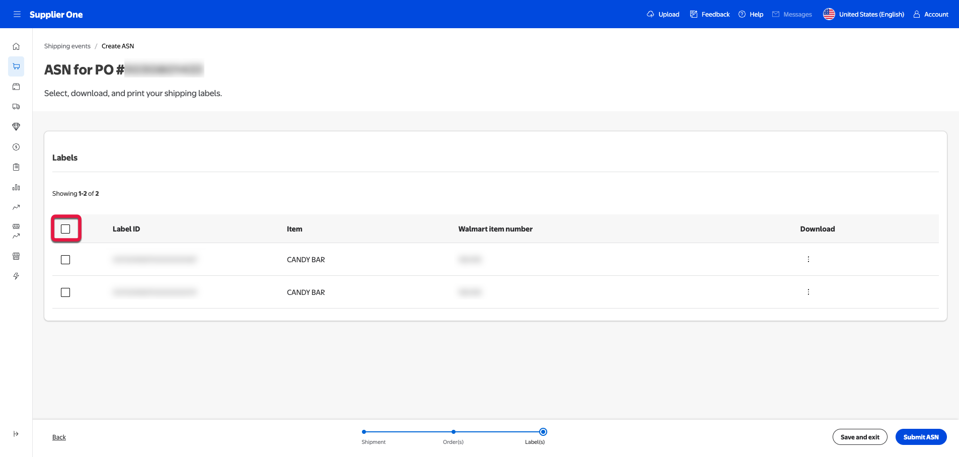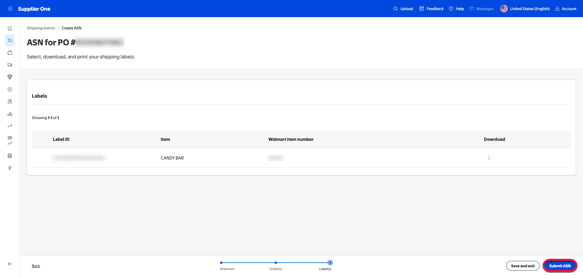 Select Submit ASN to submit the information for storage in Walmart’s system. This will take you to the PO submissions page.