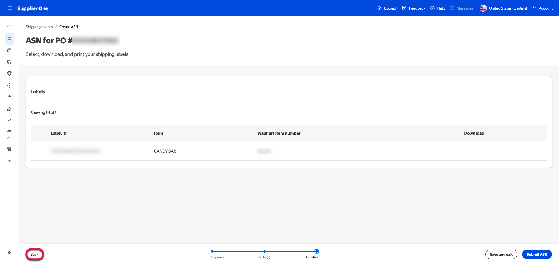 Select Create ASN next to the location number you’d like to create an ASN for. This opens the Create ASN page so you can start the ASN label creation process for this PO for this location.