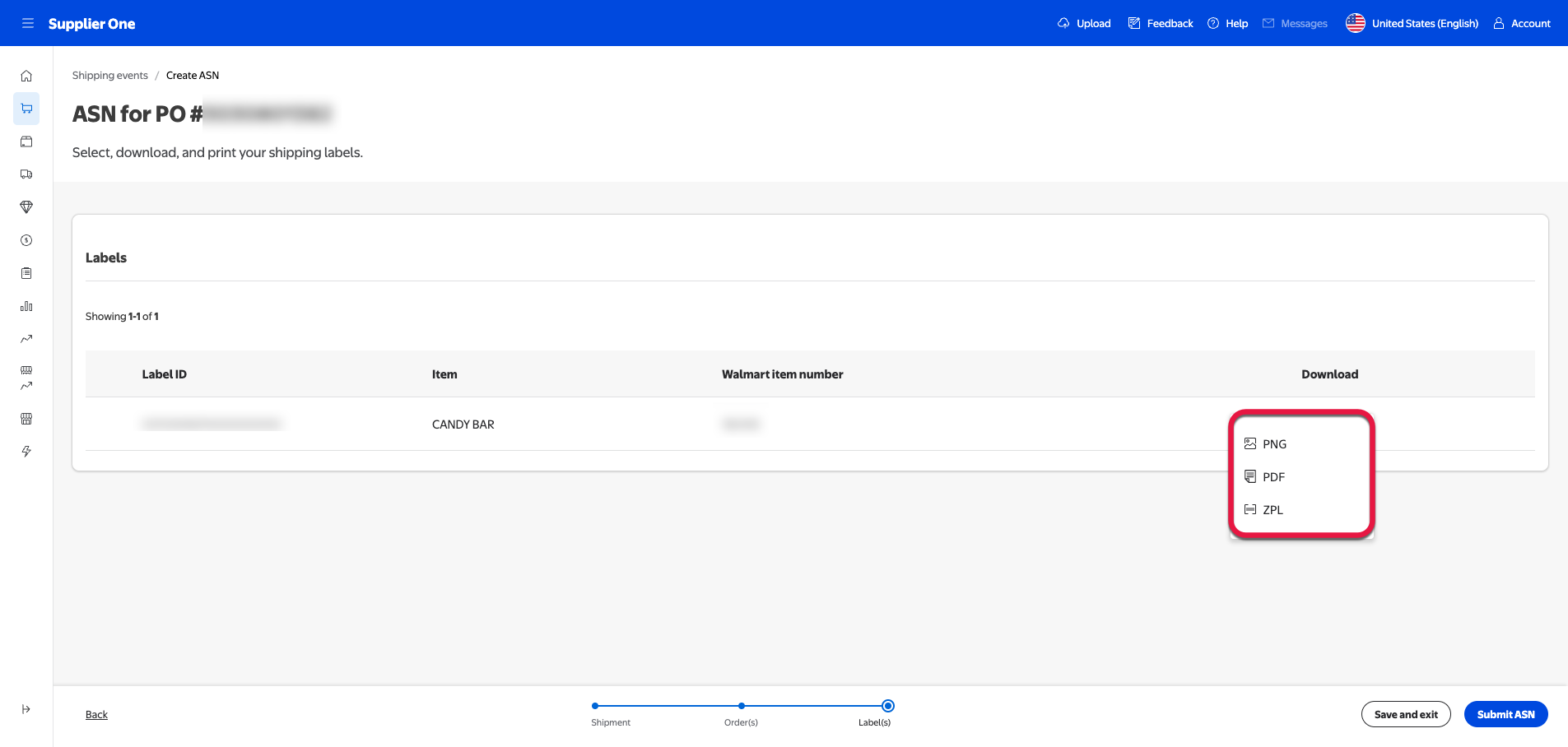 Select the three dots under the Download column to bring up a menu with the file format options (PNG, PDF, ZPL) available to download of this ASN.