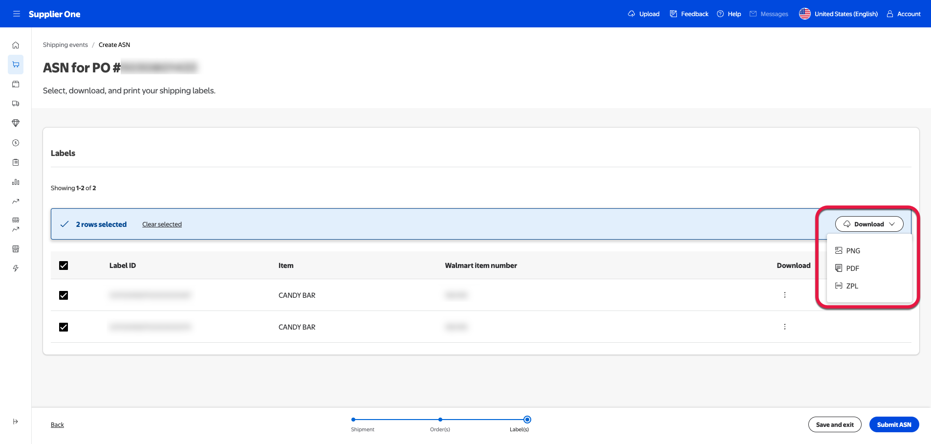 If the ASN has multiple labels, you can bulk download the labels by selecting the box next to Label ID, then pressing Download to open a dropdown menu of the possible format types.