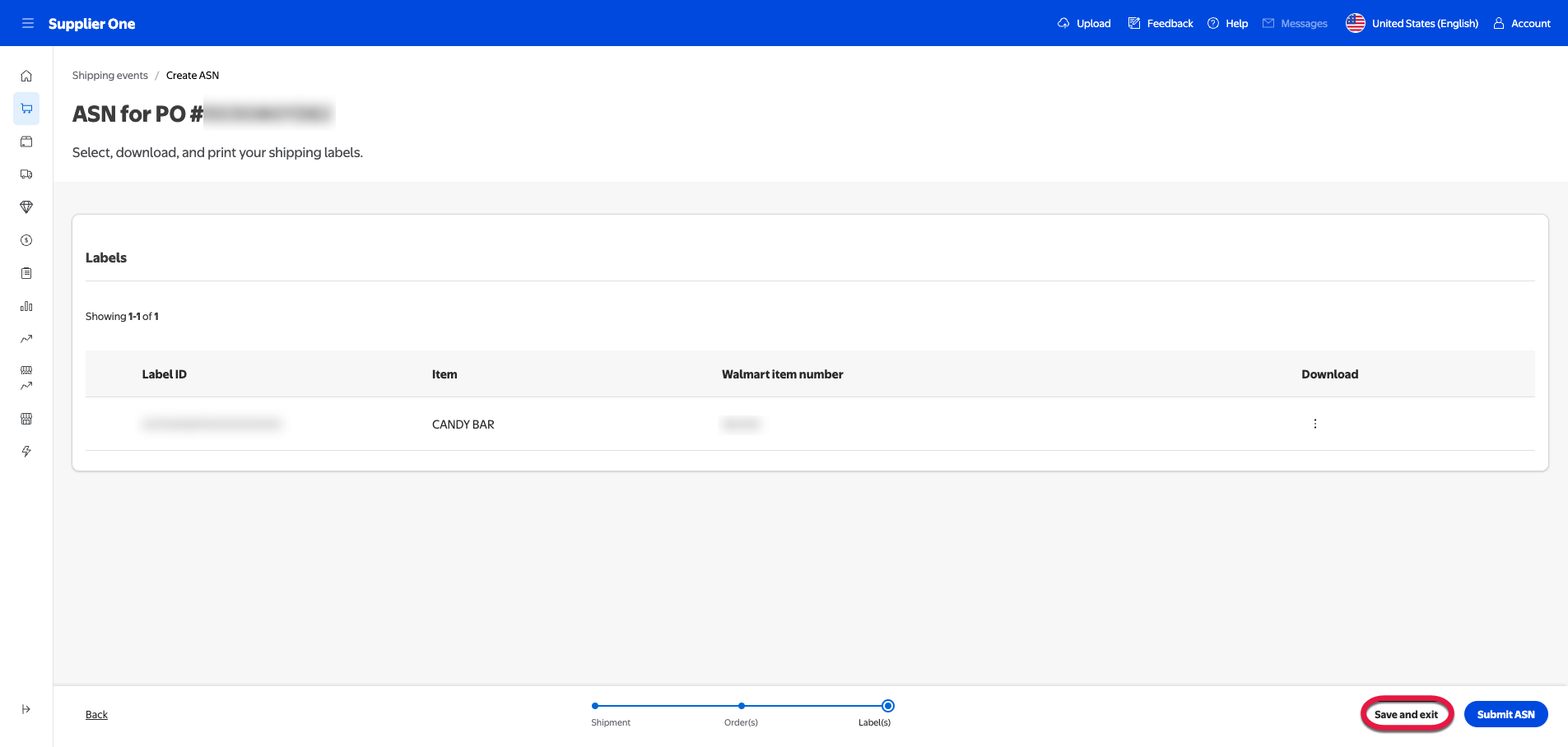 You can select Save and exit to save your edits in the submission process. You can only access and edit draft ASNs while on the PO submissions page.
