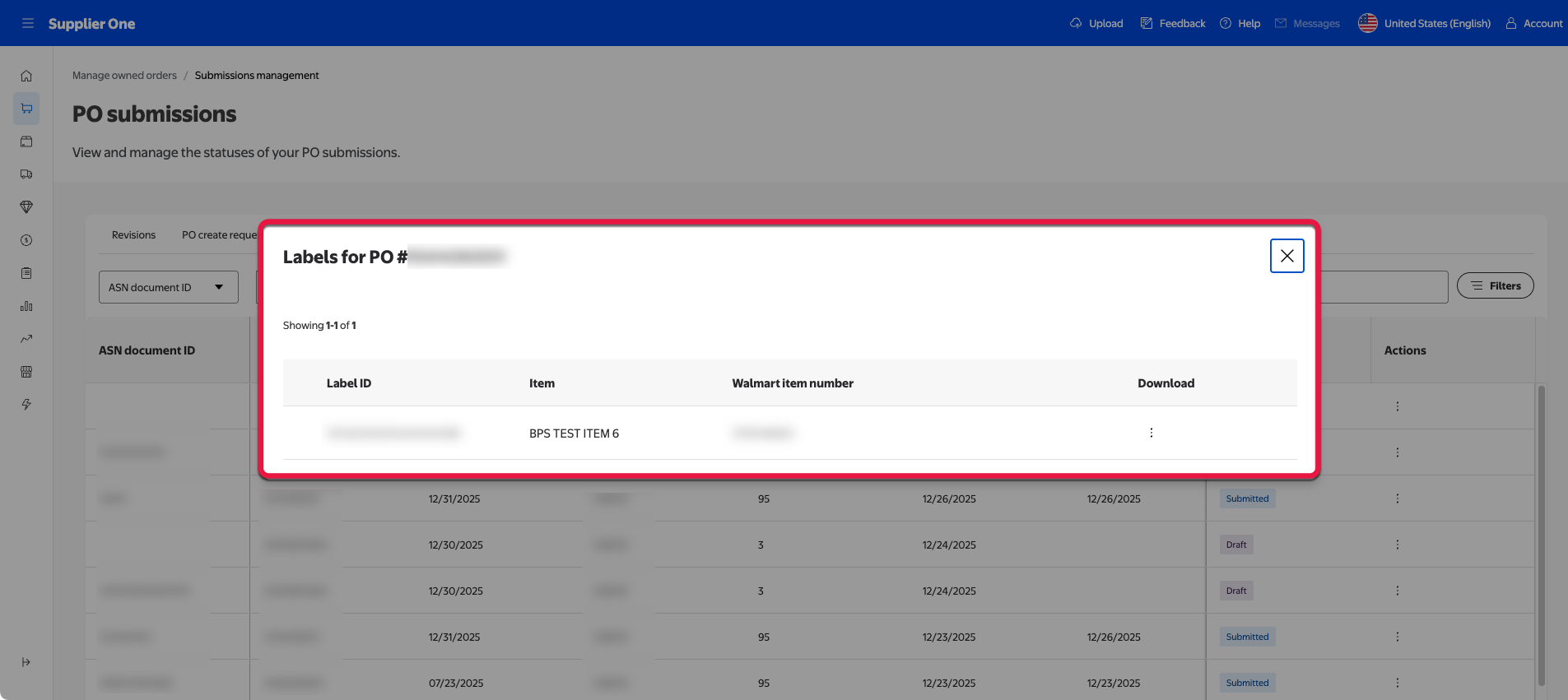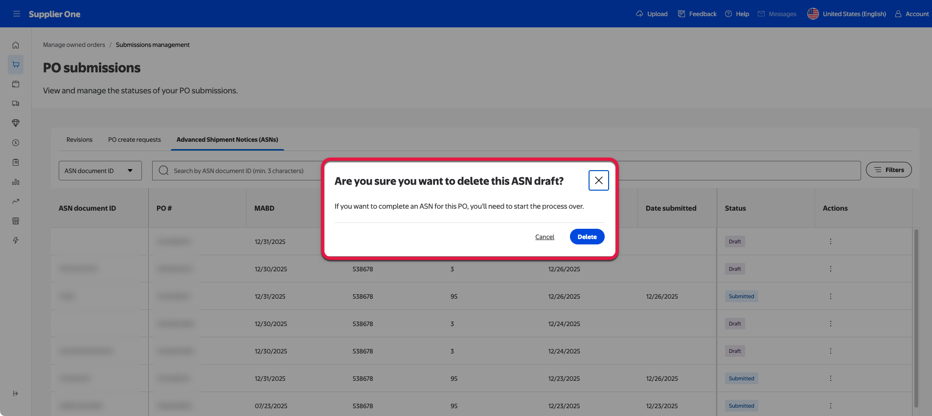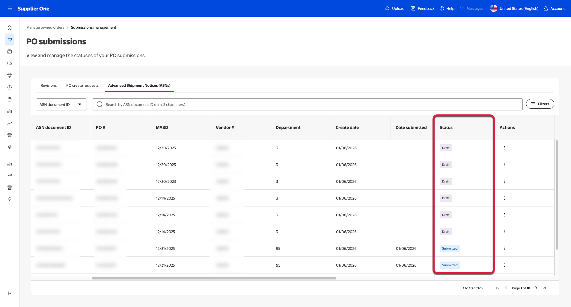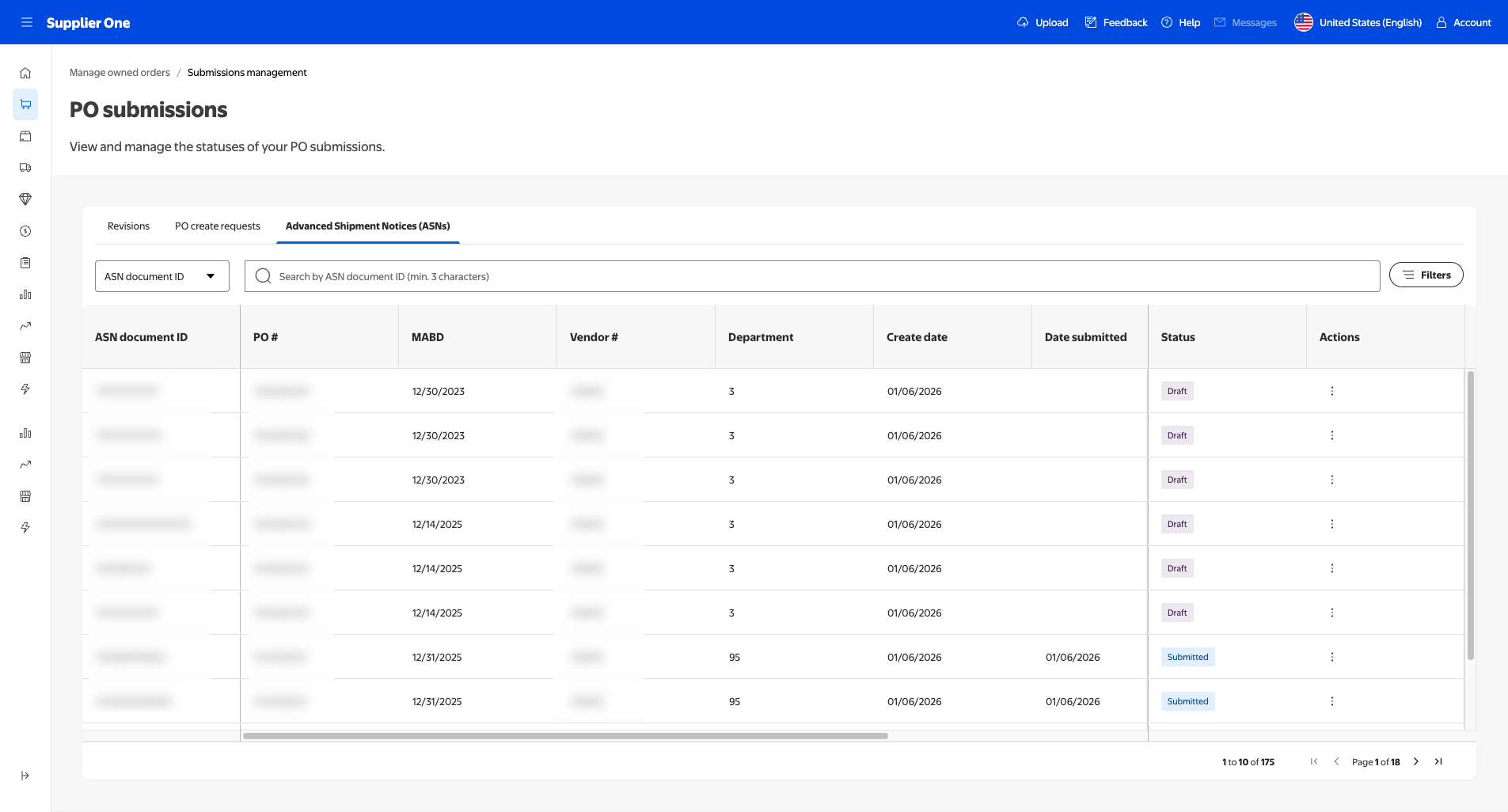This section explores the PO submissions page, located in Supplier One. Here, you can review and manage your existing submitted, draft, and rejected ASN documents.