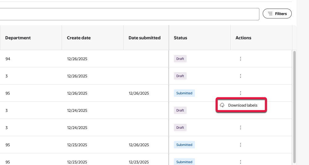 Download the label(s) by selecting the three dots under Download. A menu will appear with three downloadable options: PNG, PDF, or Zebra scannable barcode (ZPL) format. This will download the label(s) on to your device in that format.