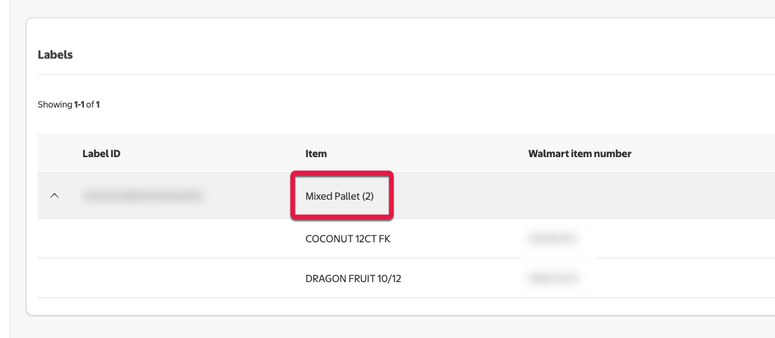 If the pallet has more than one item to be shipped on it, the item label will appear as Mixed Pallet. Select the dropdown icon (⌄) next to Label ID to see all the items in this ASN.