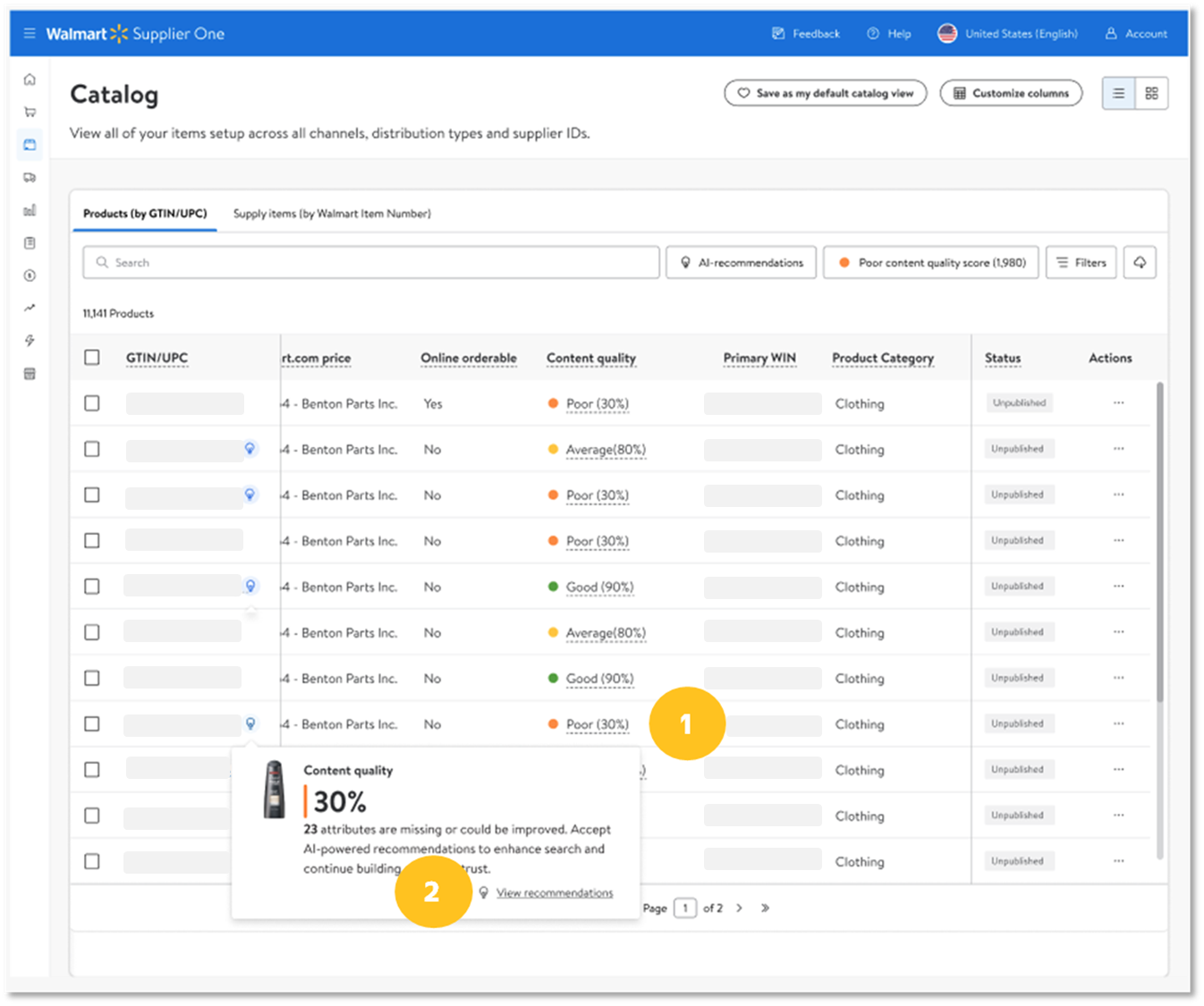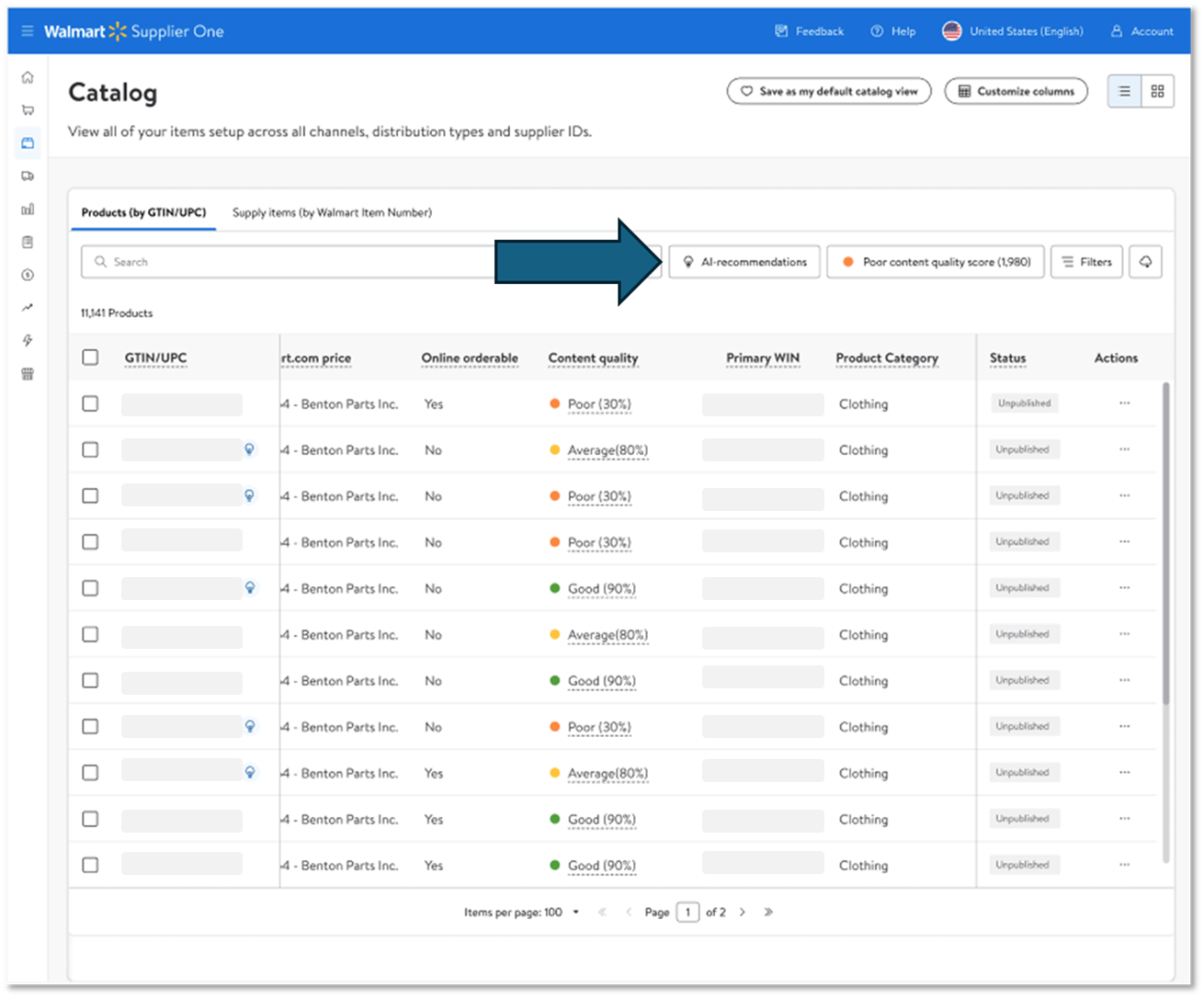 In the content quality section of the Supplier One homepage, users can click on Review AI Recommendations to view a filtered view of the catalog of items that qualify for AI recommendations.