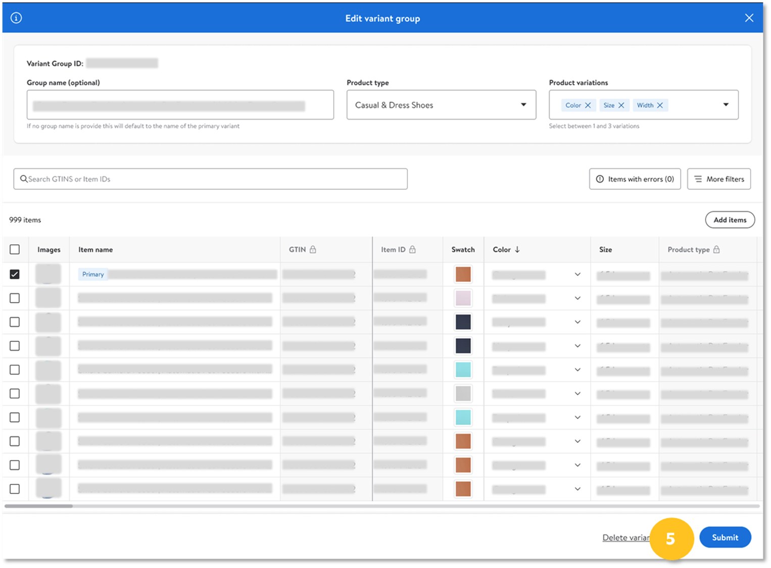 - Once the items have loaded, verify the product variation attributes are accurate, and click Submit to process the update.