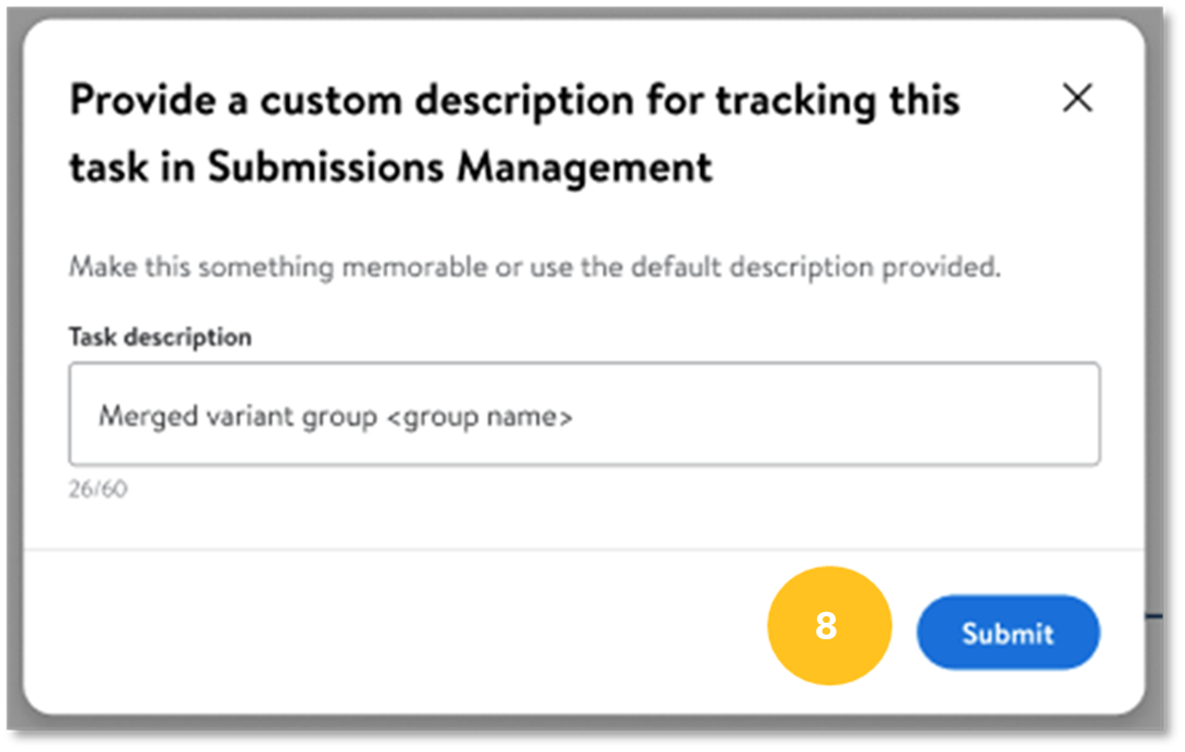 - Provide a submission description for the variant group and click Submit. To track your submission, you can go to the submissions manager in Supplier One.