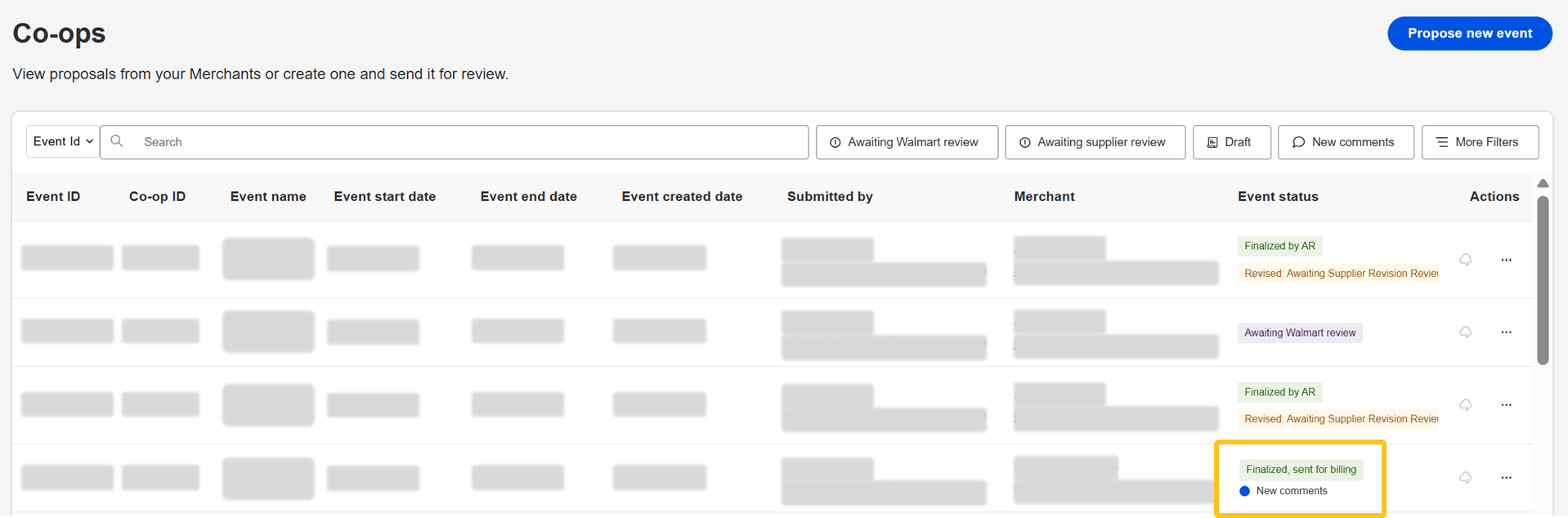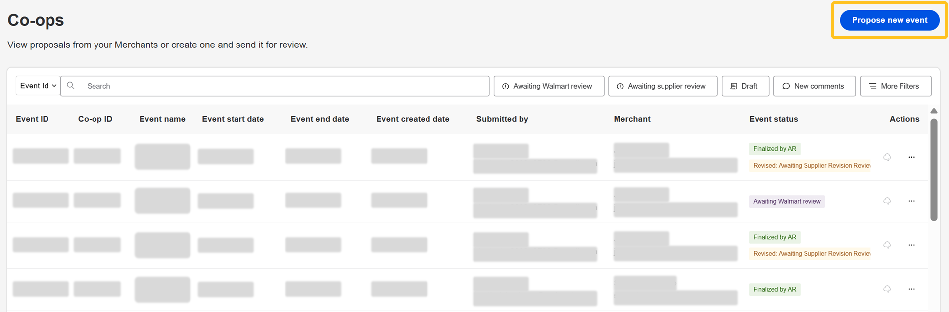 - Quick Filters for Event status are Awaiting Walmart review, Awaiting Supplier review, Draft, and New comments.