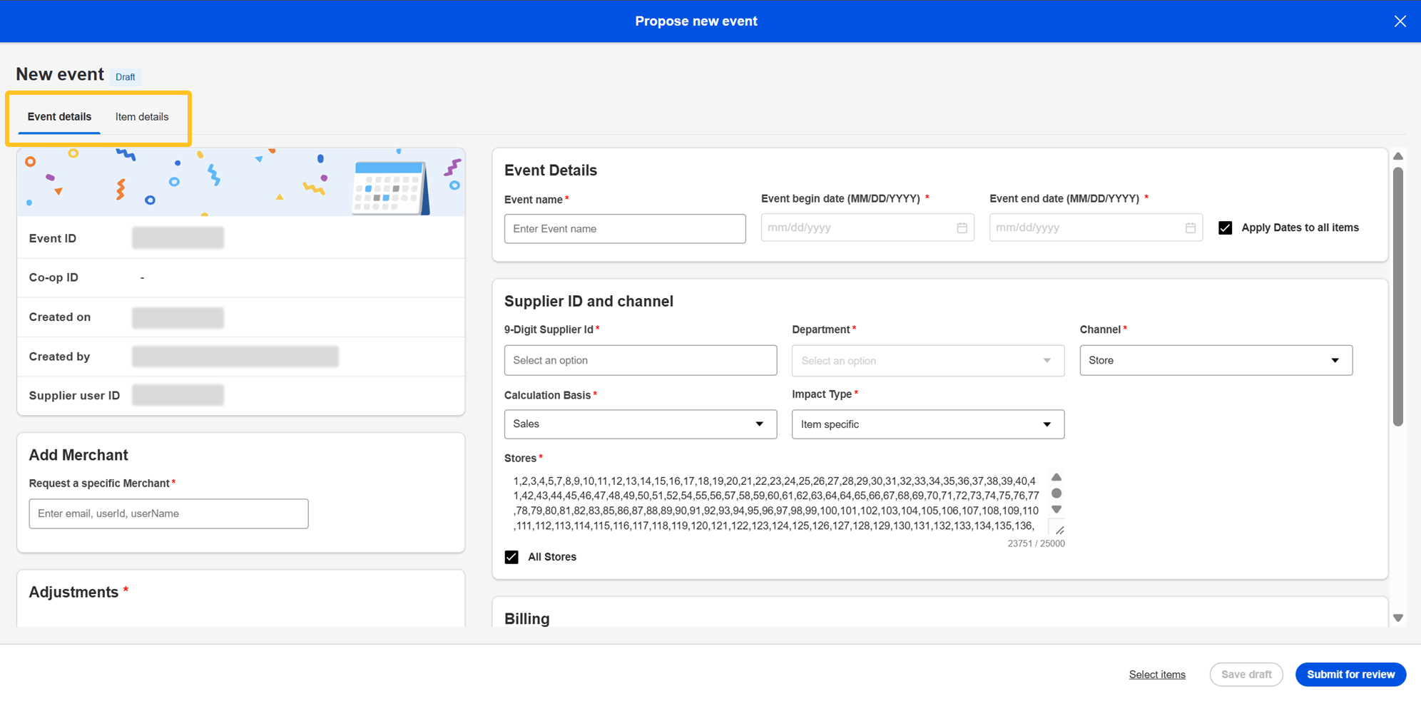 You will be prompted to enter required fields under Event details and Item details tabs.