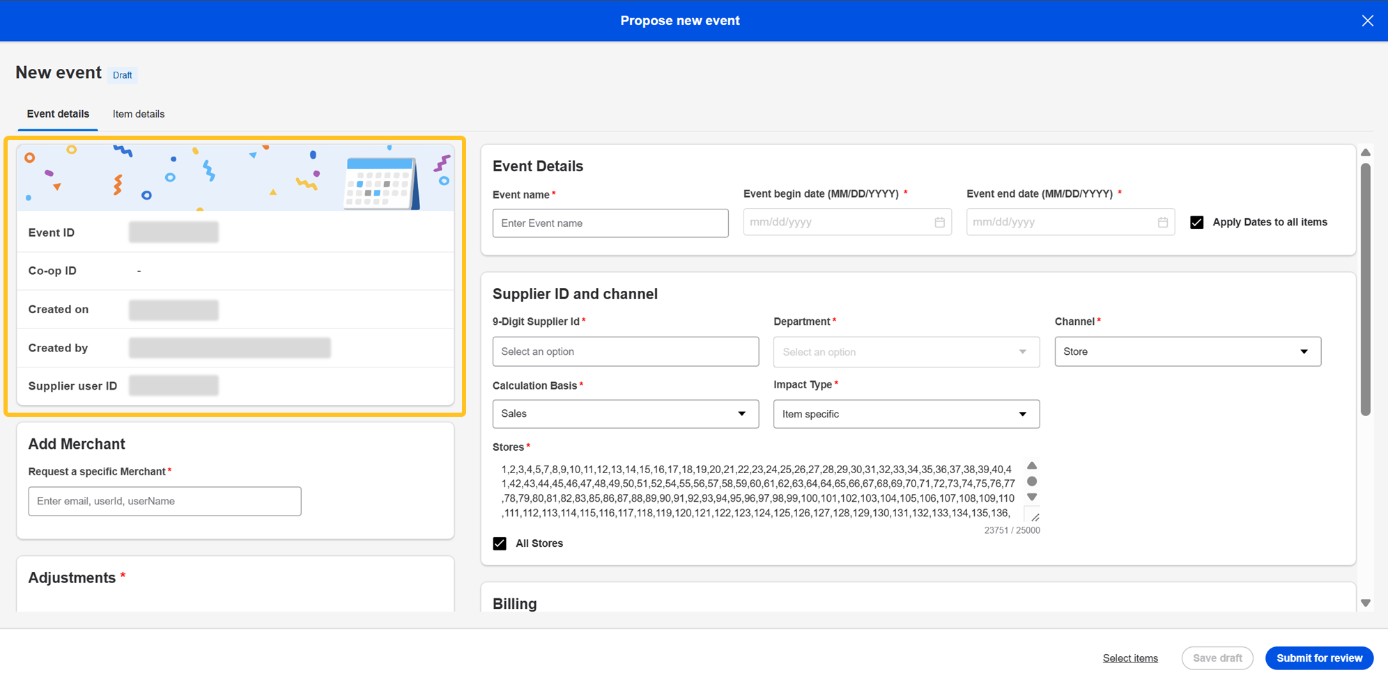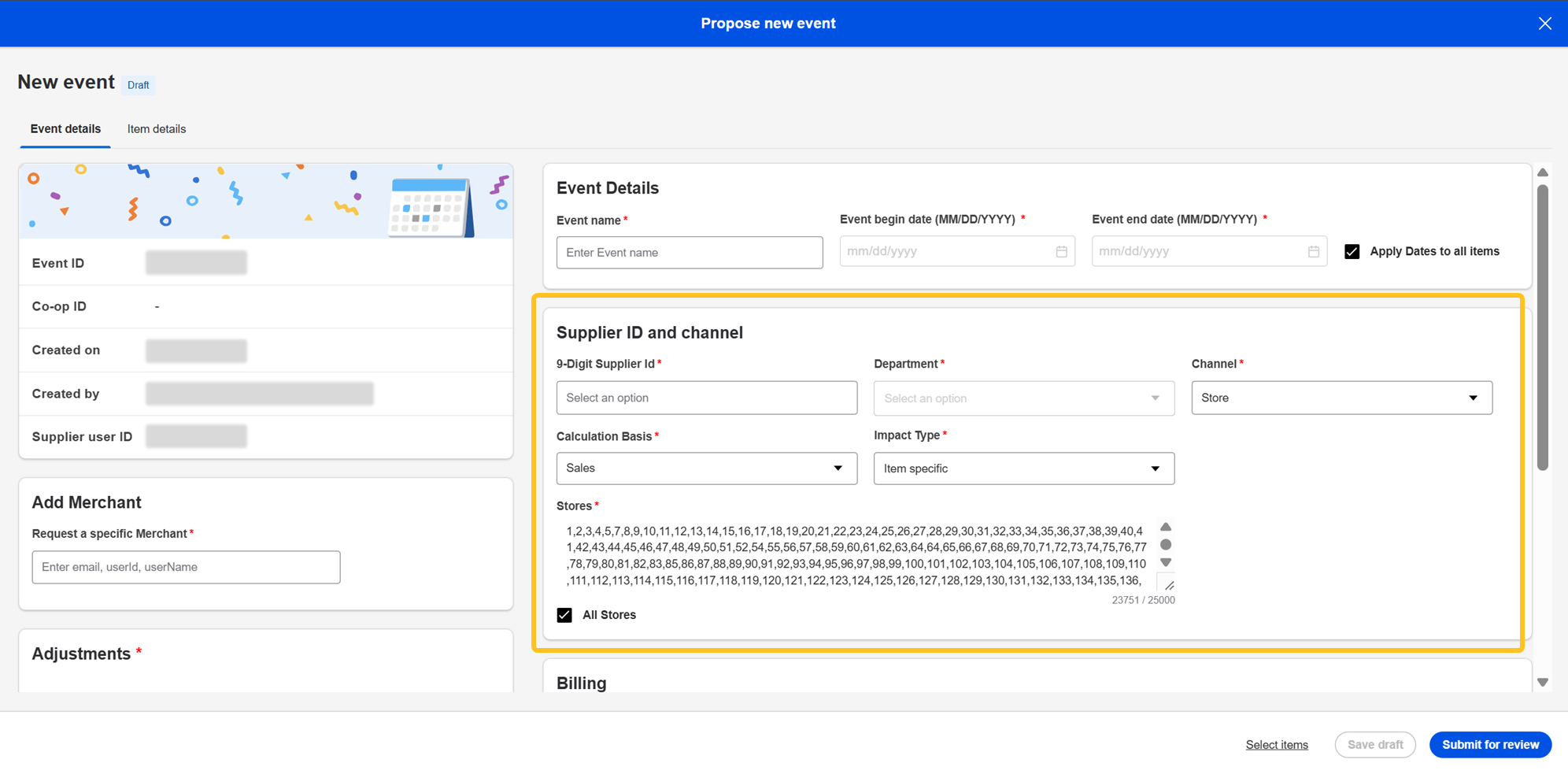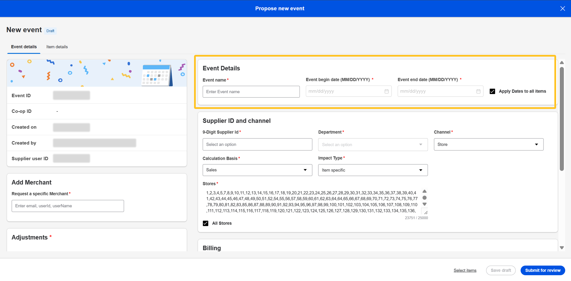 Suppliers now have the ability to create future and past-dated Events directly in Supplier One for Stores and Dotcom. Once approved by both the Merchant and the Supplier, the Event is assigned a Co-op ID. The Co-op start date is determined based on the Event start date, not the collection dates.