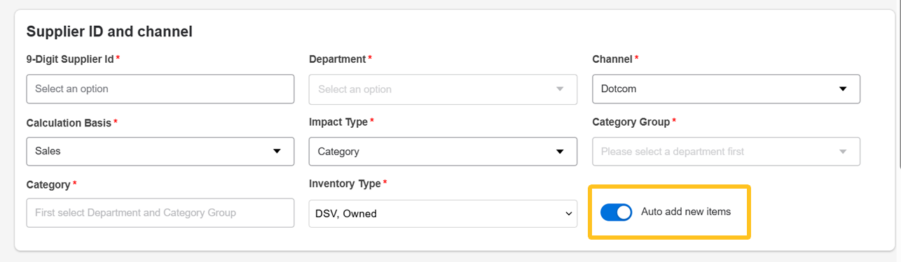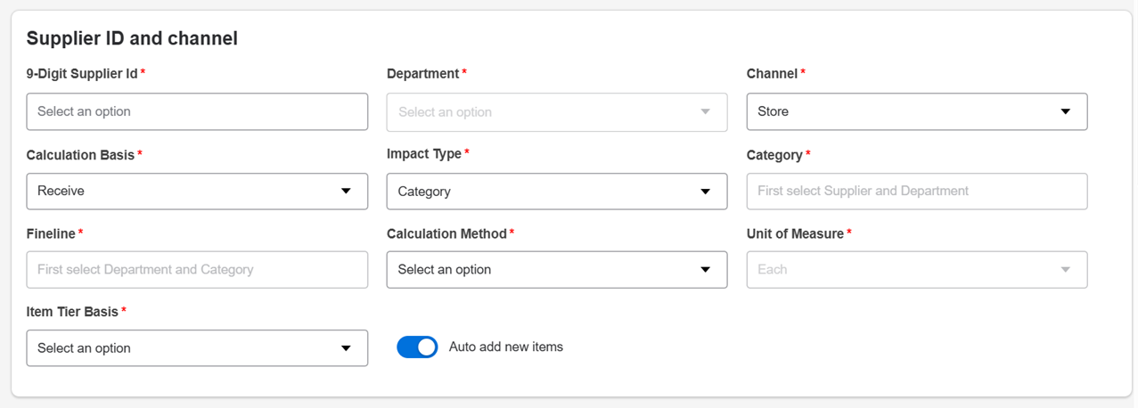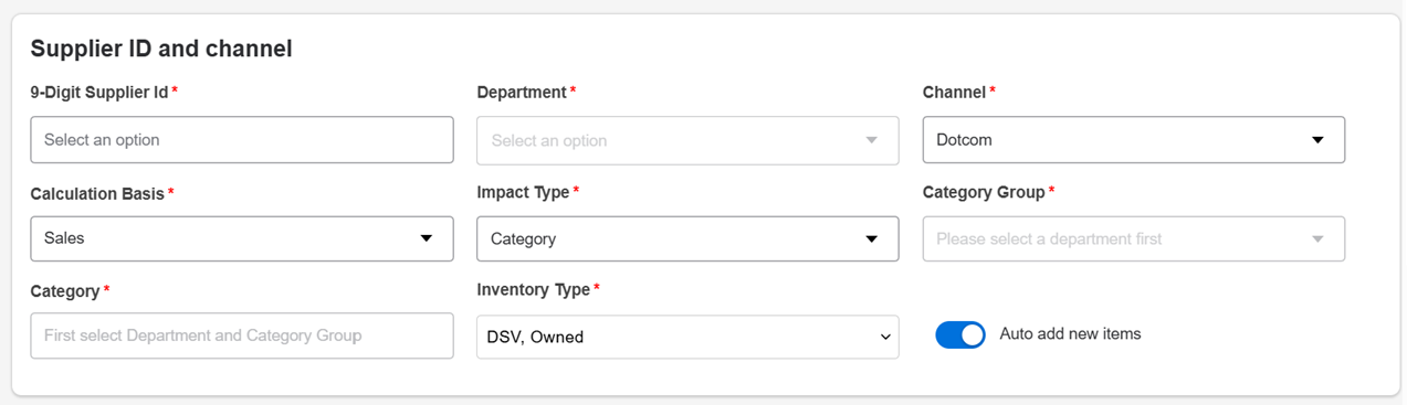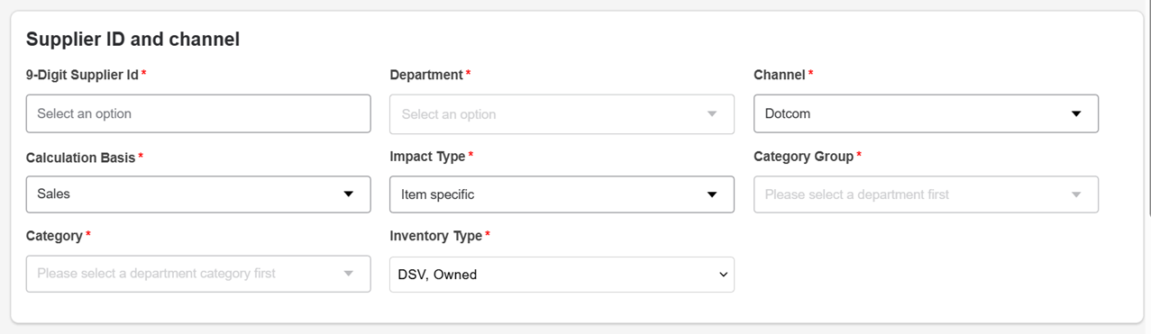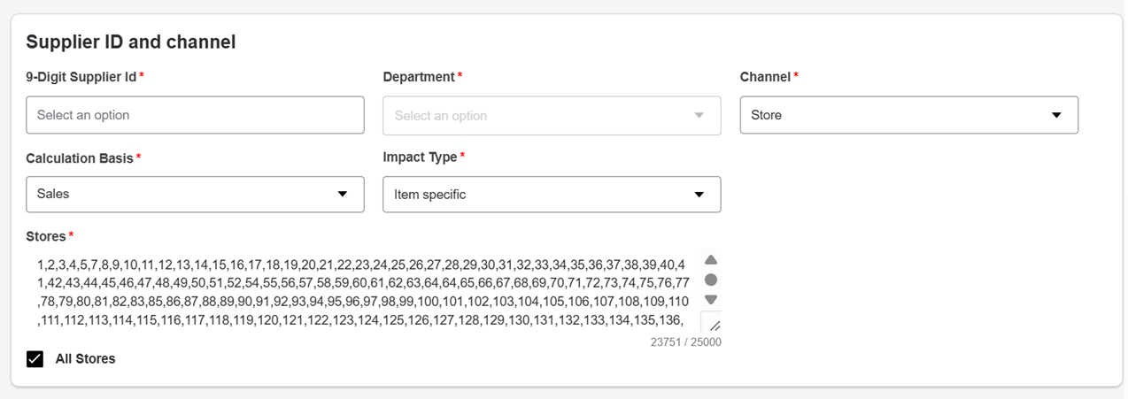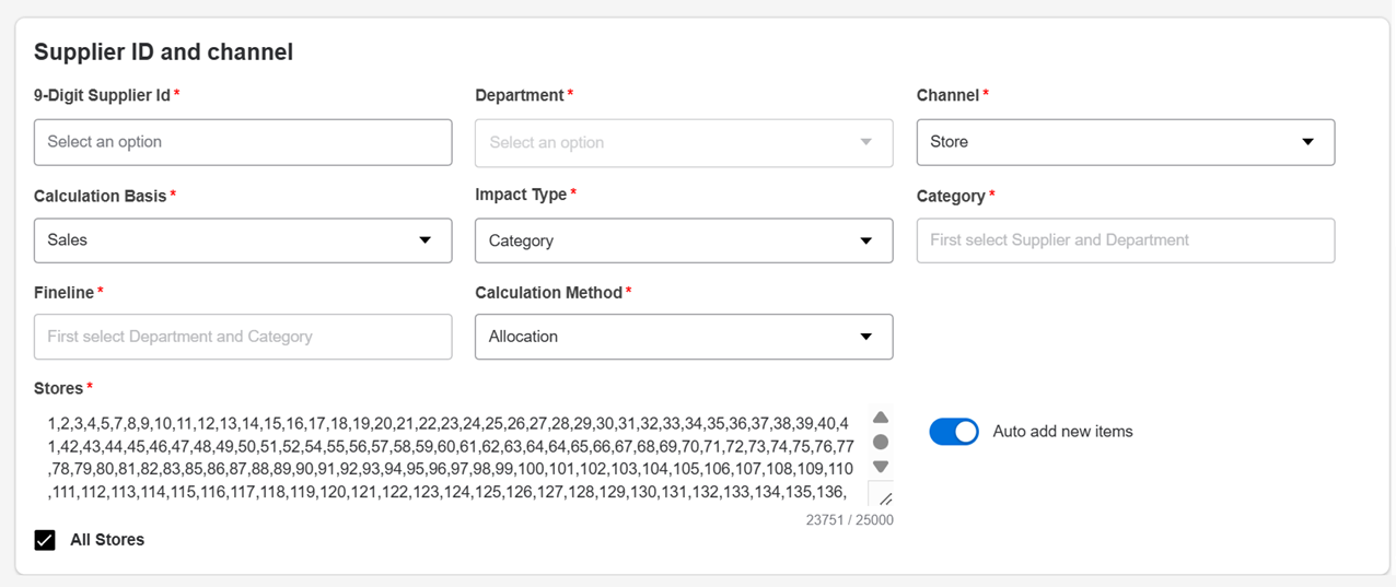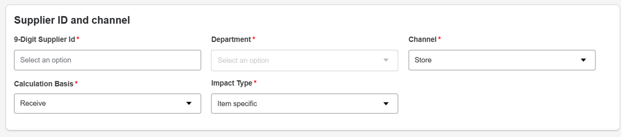 Select the 9-digit supplier number, Department, Channel, Calculation Basis (Sales or Receive), Impact Type (Category or Item Specific) from the drop-downs.