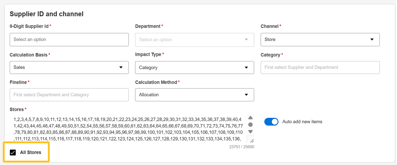 All stores will automatically select. To update, unselect All Stores copy and paste store numbers or enter manually.