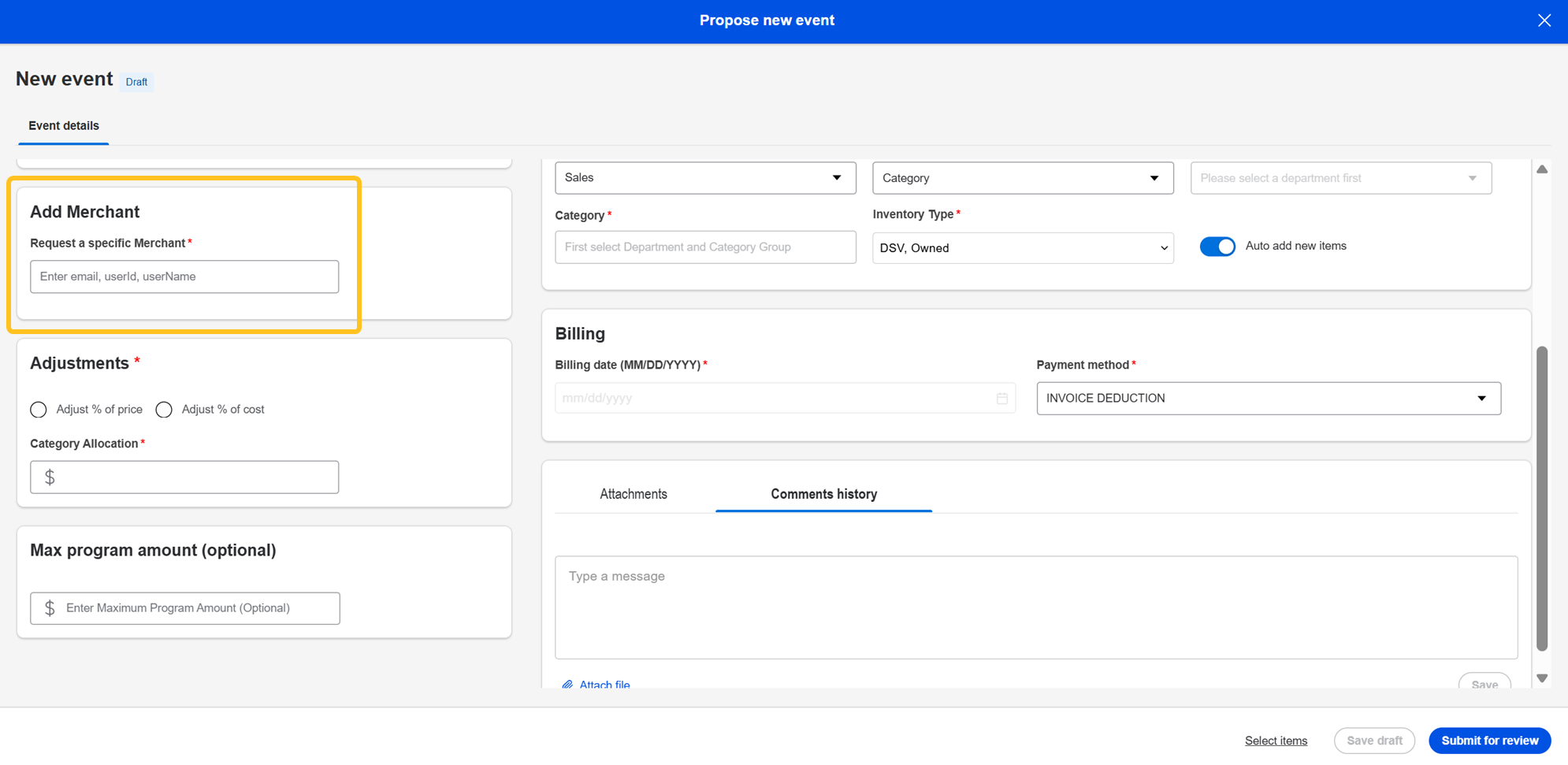 Add the email address of your Merchant, who will review and approve the Event proposal.