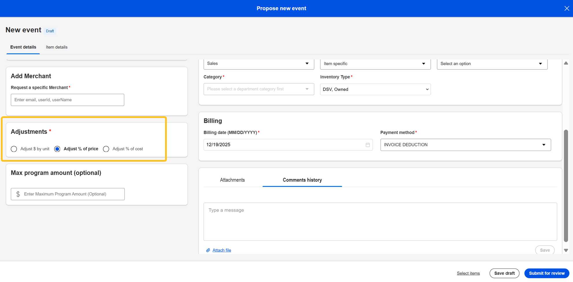 - Adjust $ by unit: Supplier is funding an amount per unit (e.g., for item number 123456789, a $2 input would mean that $2 will be collected per unit sold)