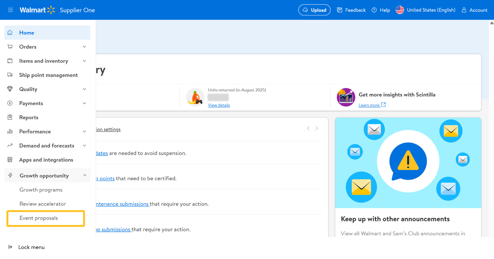 In the left navigation menu of Supplier One, click Growth opportunity and select Event proposals. Or navigate directly to https://supplierone.wal-mart.com/coop.