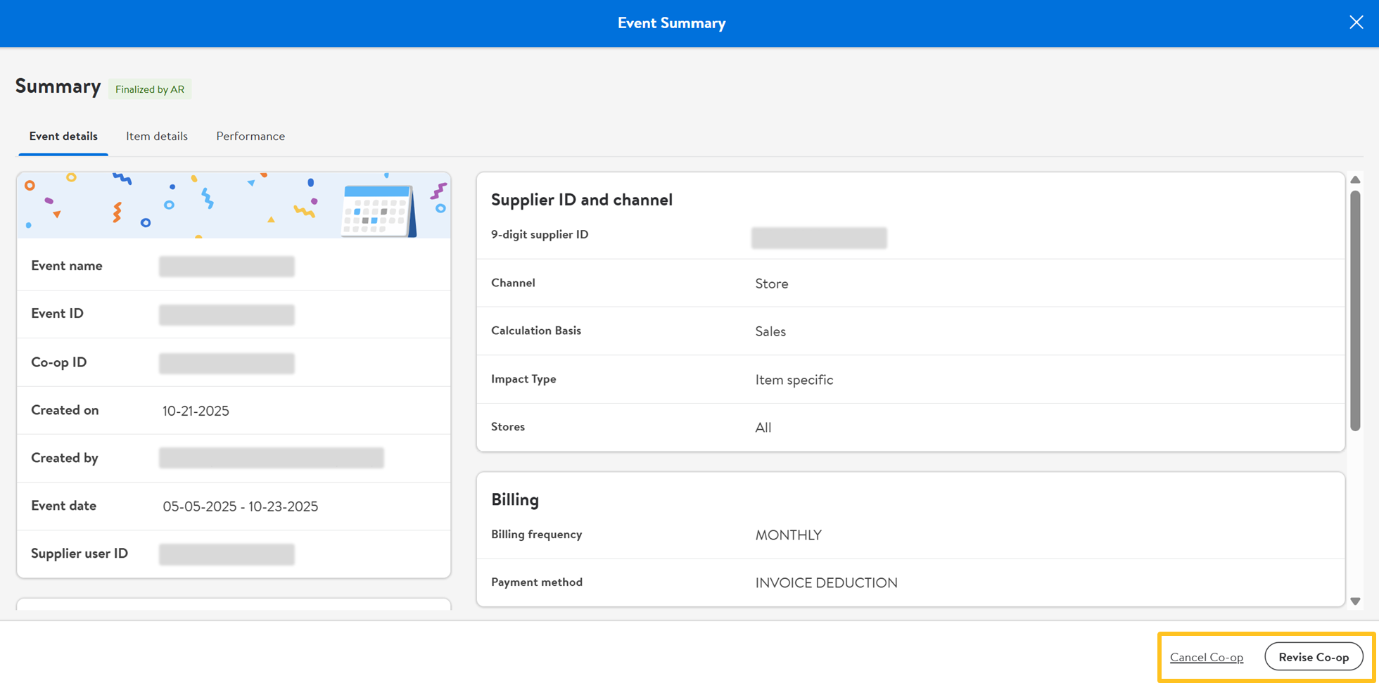 - Select the Event Id dropdown to change the view by Event ID, Co-op ID, Event Name, or Supplier ID.