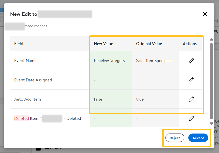 - If your merchant edits the event proposal after submission, you will see the new and original values and can select to Reject or Accept the changes. Under Actions, select the pencil icon to edit the value.
