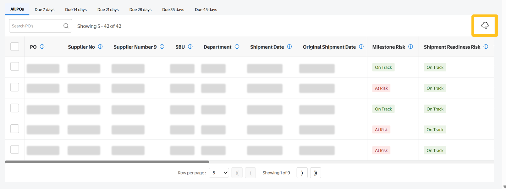 - To select specific POs, select the check box next to each PO and click the cloud icon to download only those.
