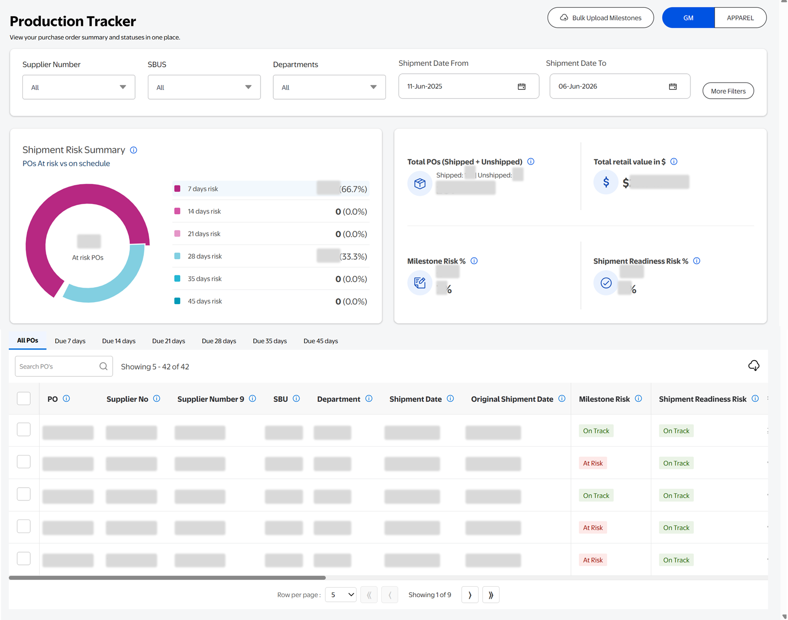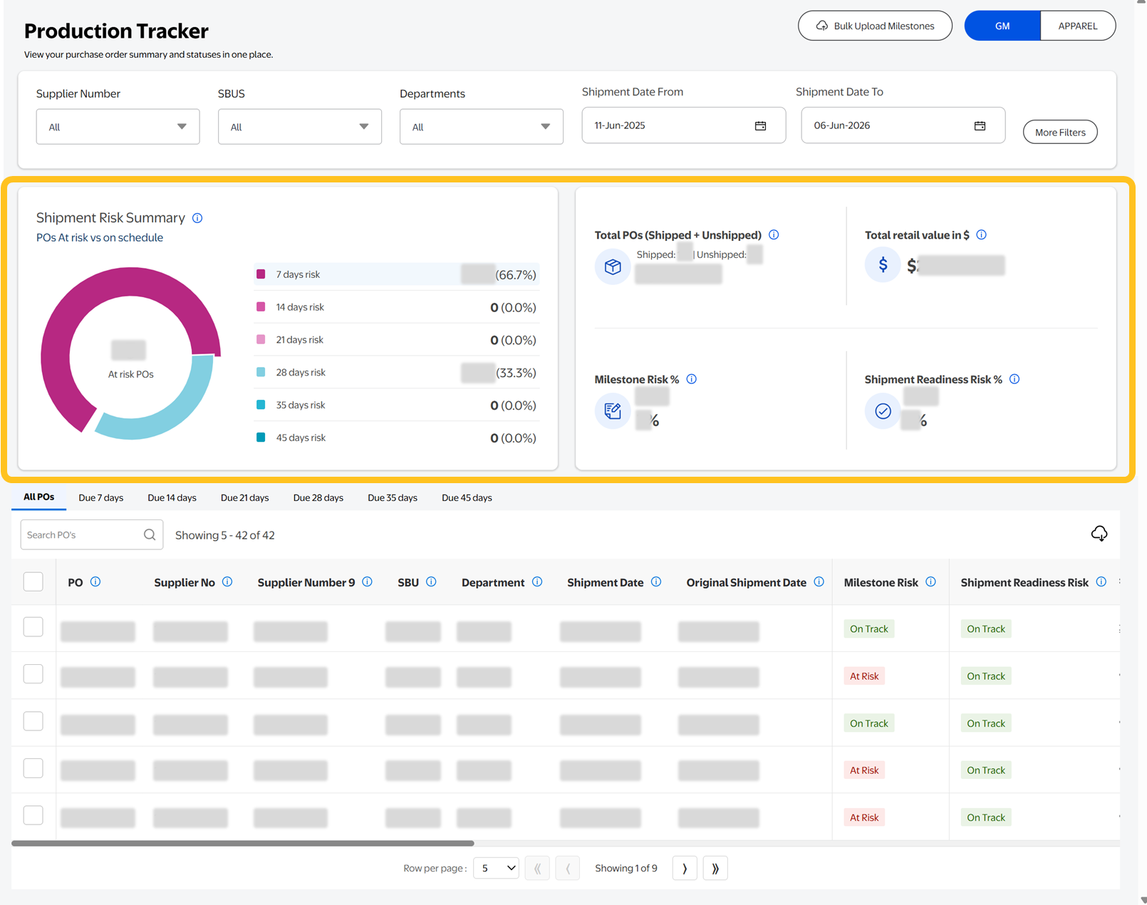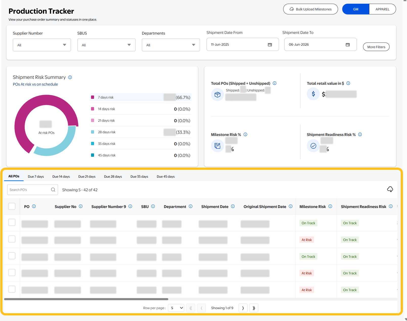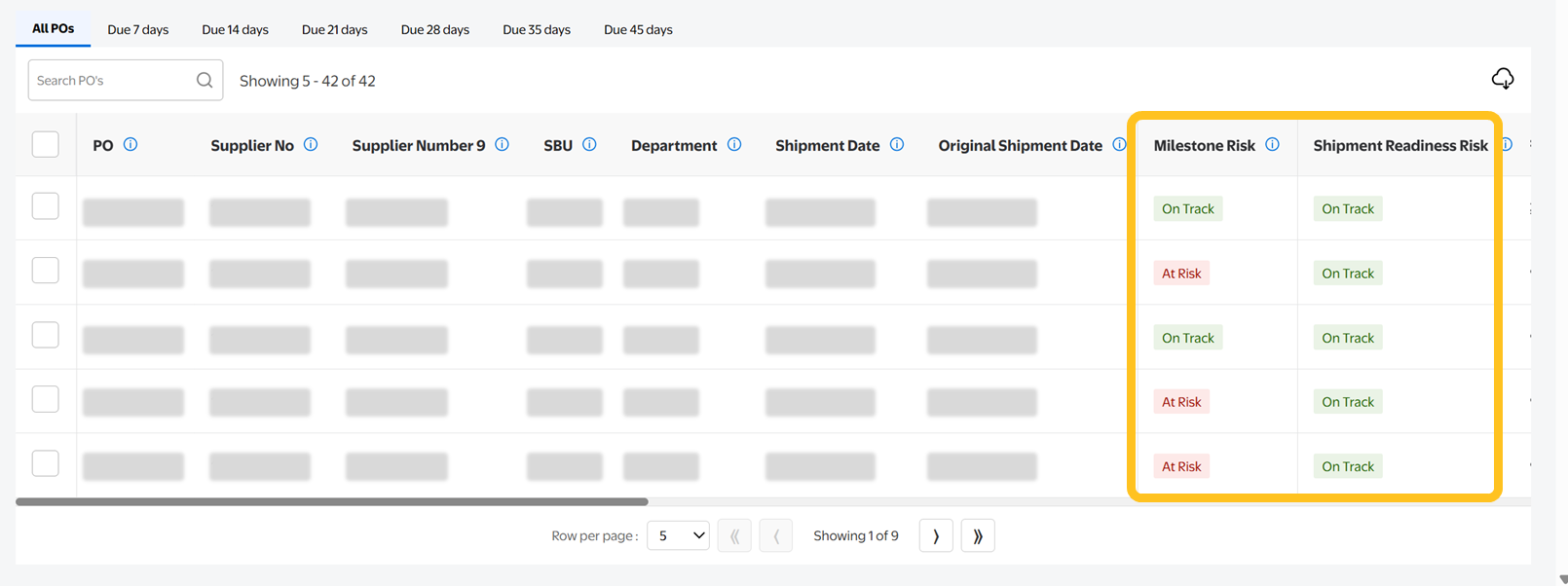 - PO Shipment Timeline tabs: POs are grouped by days remaining until shipment (All POs, Due 7 Days, Due 14 Days, Due 21 Days, Due 28 Days, Due 35 Days, Due 45 Days).Scroll to the right to view detailed attributes for each PO.