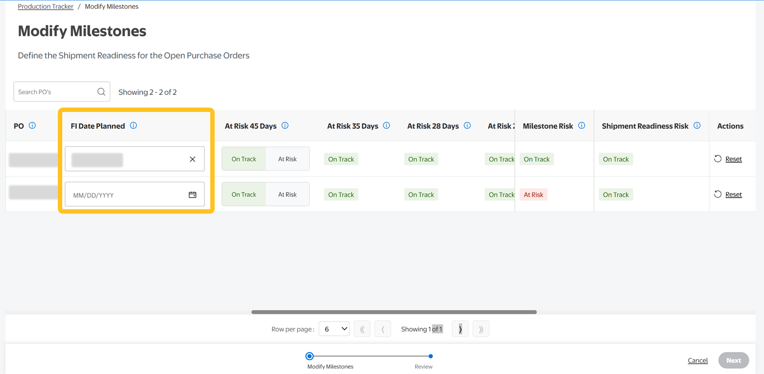 - If you've selected more than one PO, you will be prompted to provide delay reasons if the other PO FI Planned Date remains empty.