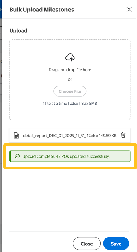 Users can update milestones either through intuitive digital screens or via Excel batch uploads. Real-time feedback ensures easy tracking and immediate visibility into which entries classify a Purchase Order as “At Risk” or “High Risk”.