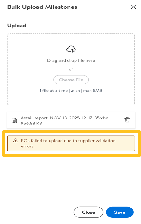 - If any POs fail during bulk upload, the system will generate a file with the errors stating: