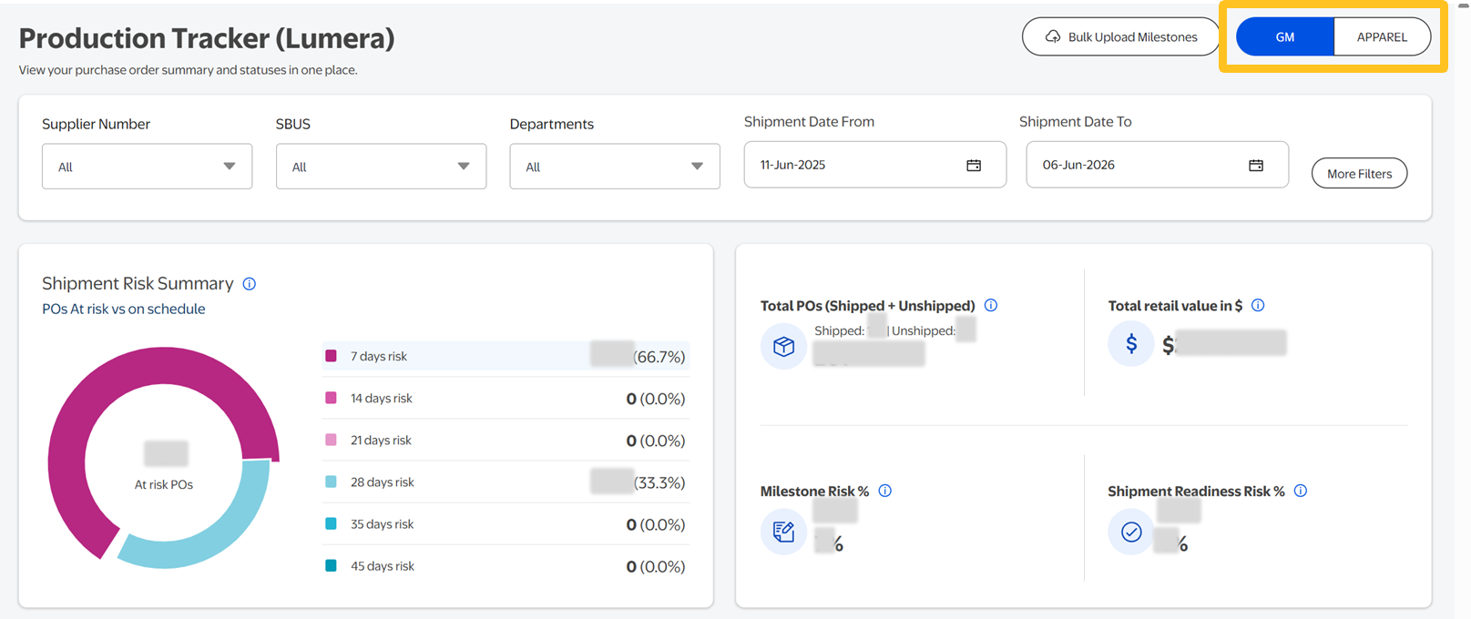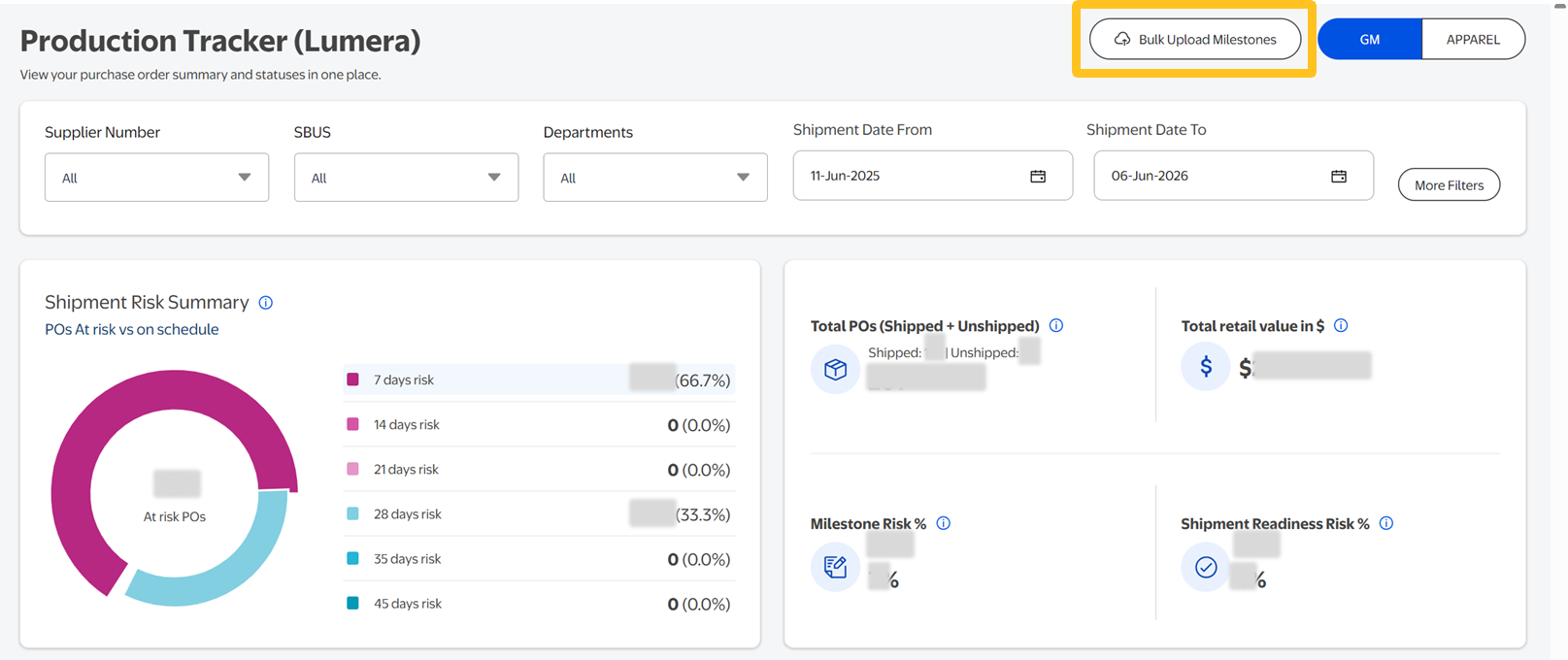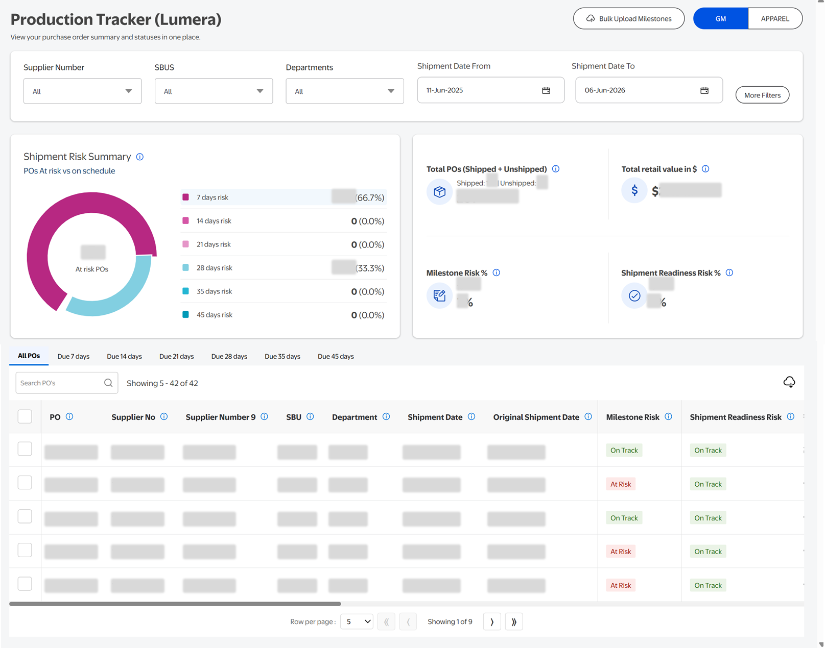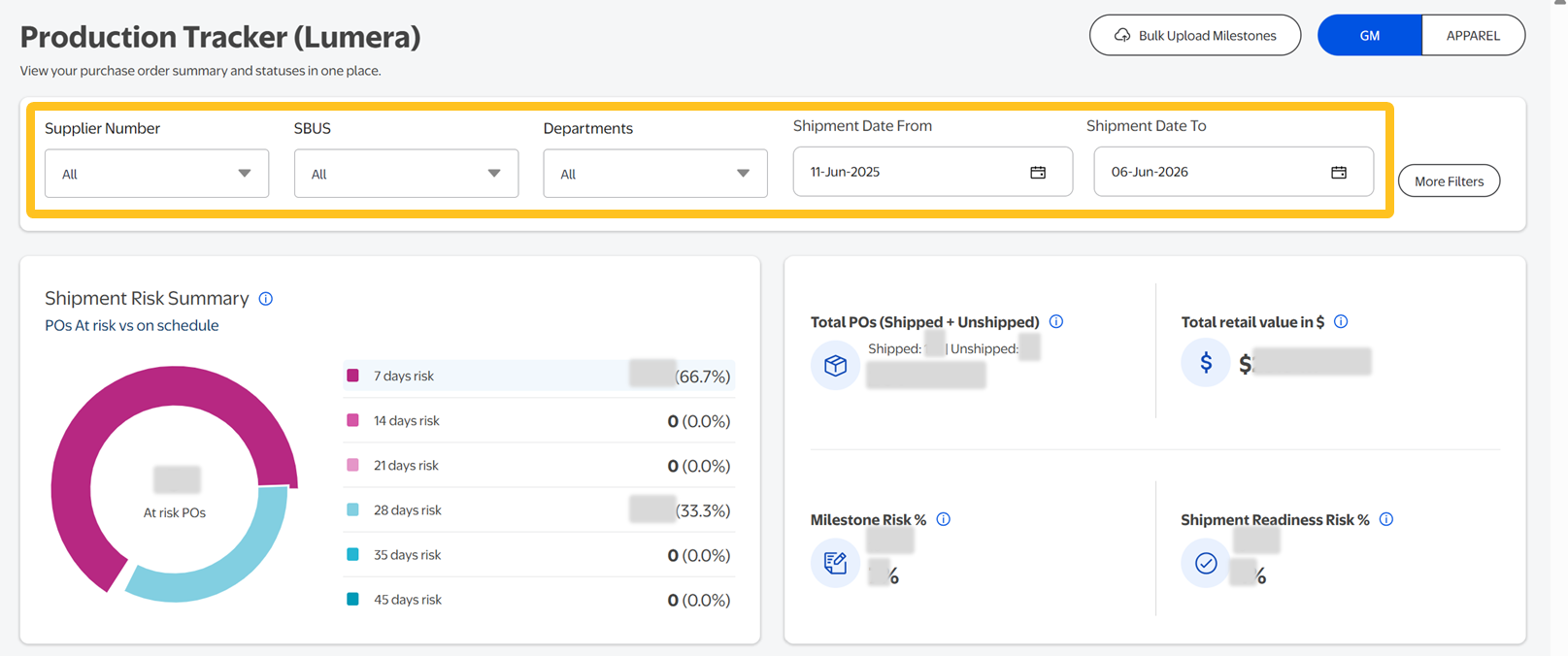 Import suppliers with owned orders can utilize the Production Tracker (Lumera) in Supplier One to capture key milestone details, including shipment readiness confidence starting 45 days prior to shipment, along with other quality-related fields such as Final Inspection Planned Dates, Sewn Qty Actual, etc.