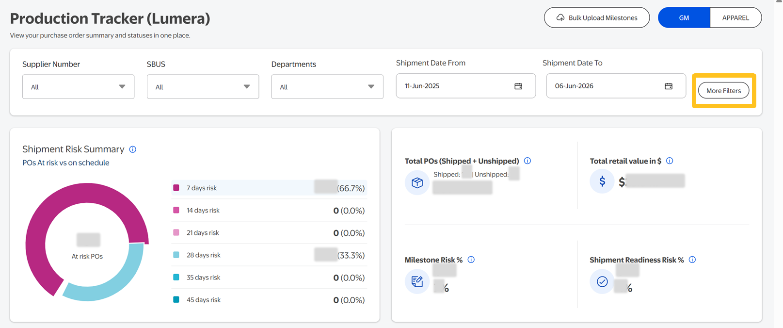 - The Production Milestone Dashboard includes an overall risk summary for all unshipped owned orders and PO shipment timelines.