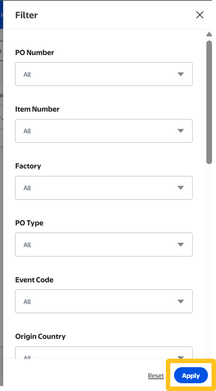 - Click More Filters for additional filter options such as PO Number, Item Number, Factory, PO Type, Event Code, Origin Country, etc.