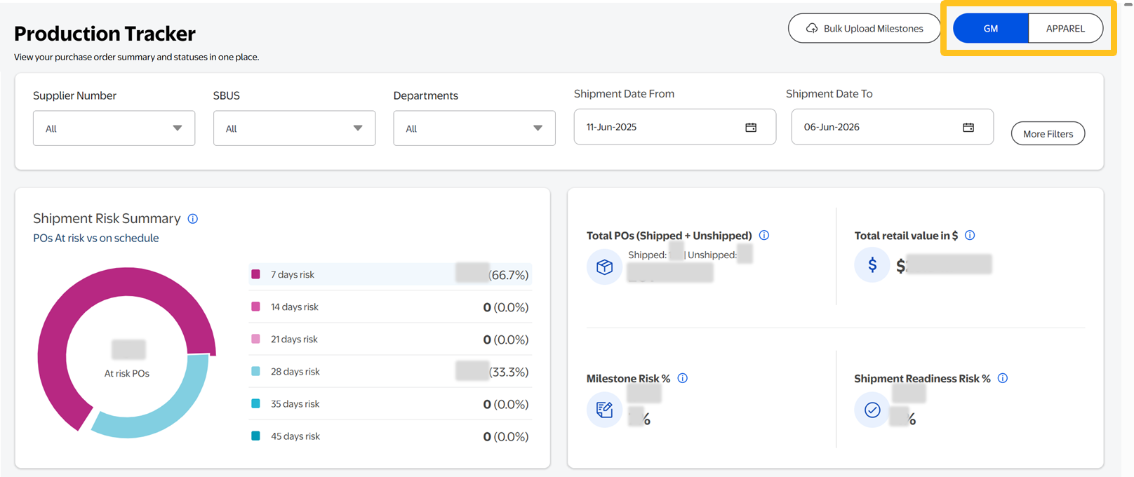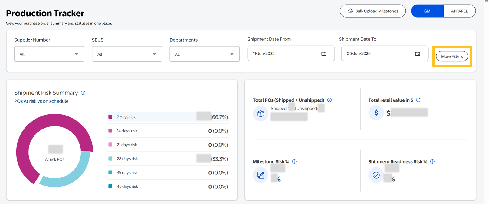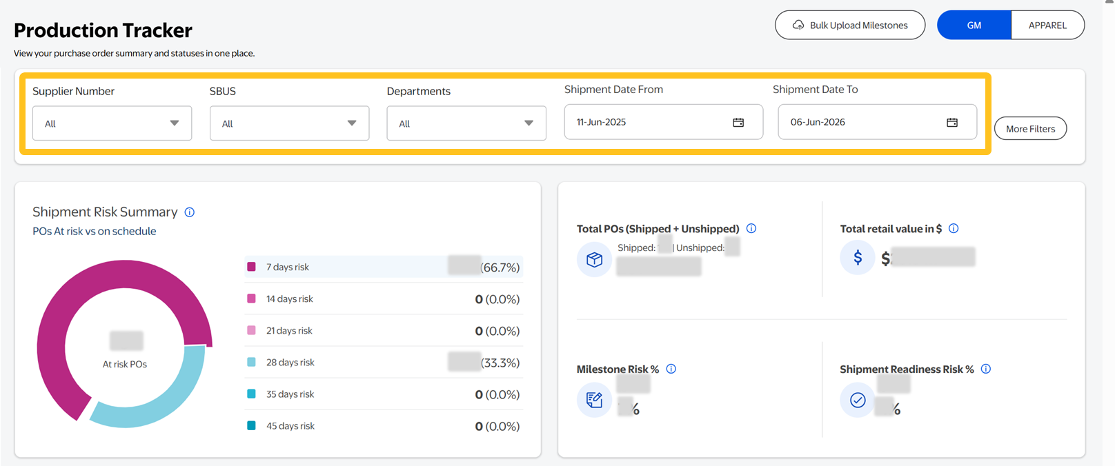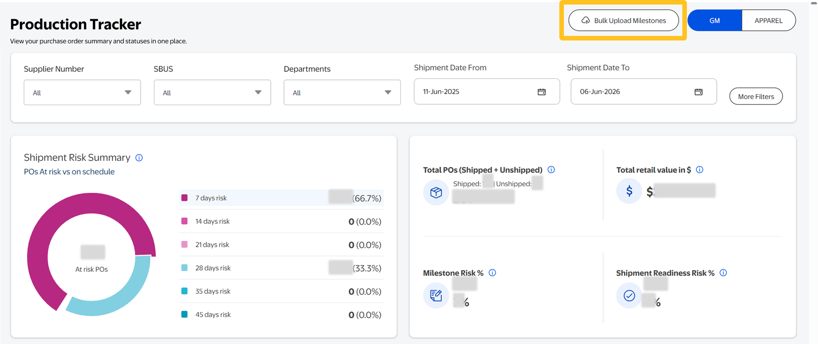 - Shipment Risk Summary: Overview of shipment risks to allow you to address issues quickly with timely resolution by clicking on the days at risk to jump to the table view of the POs.